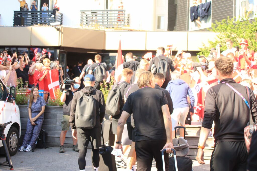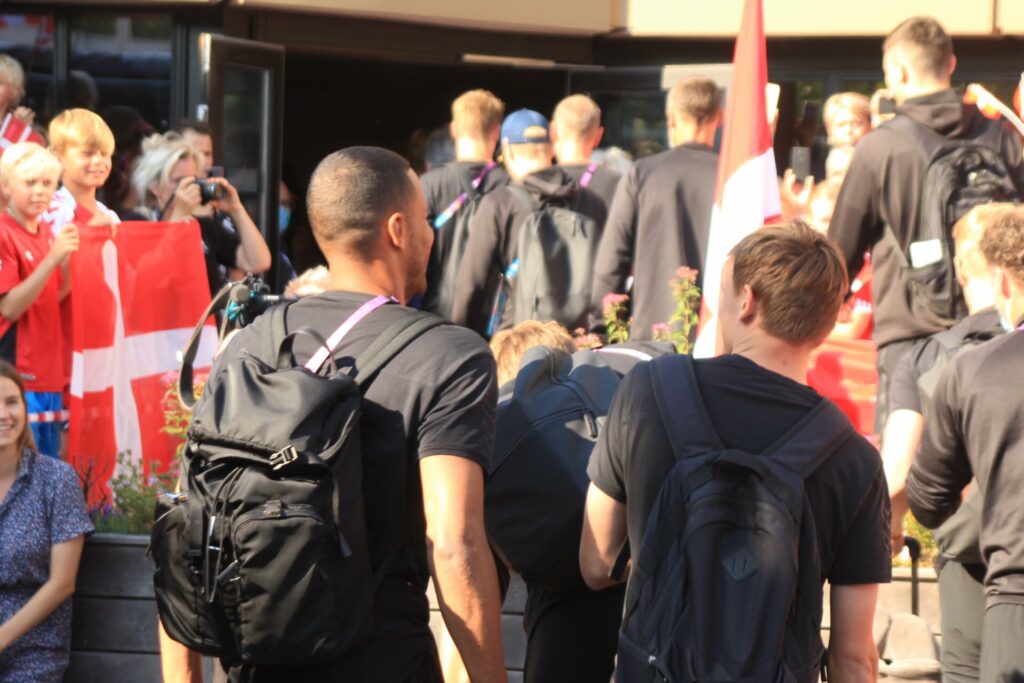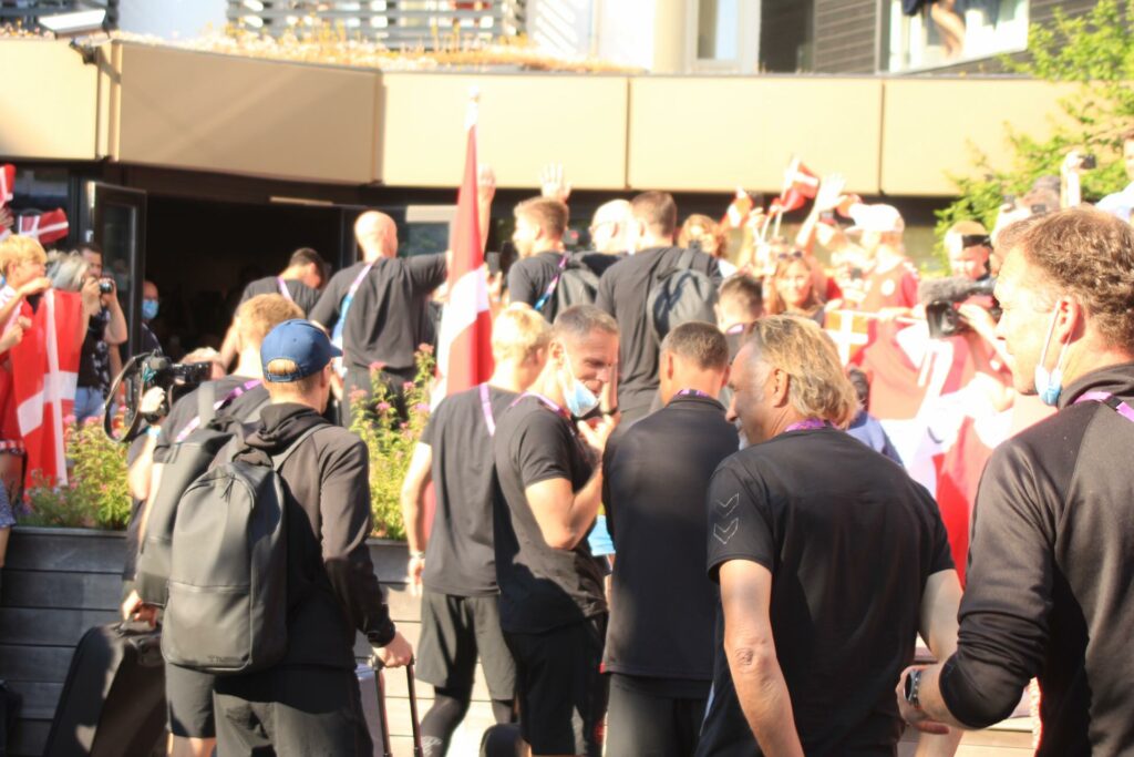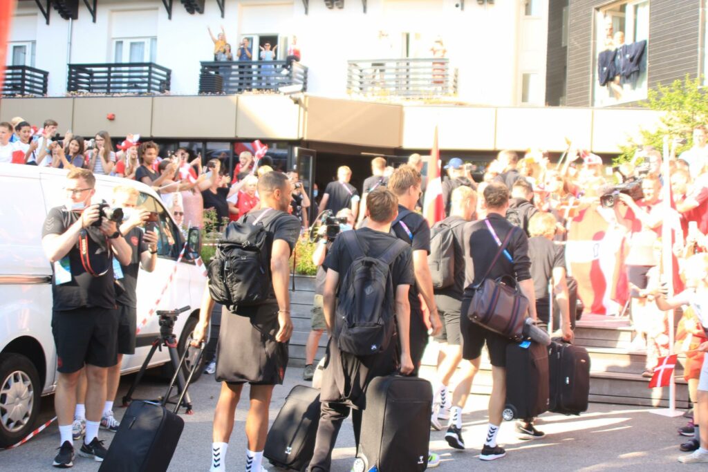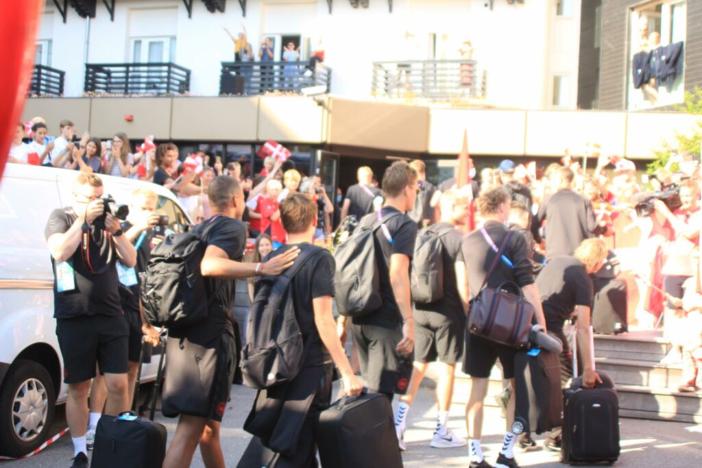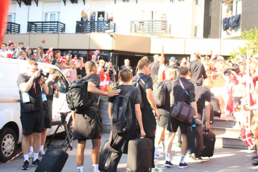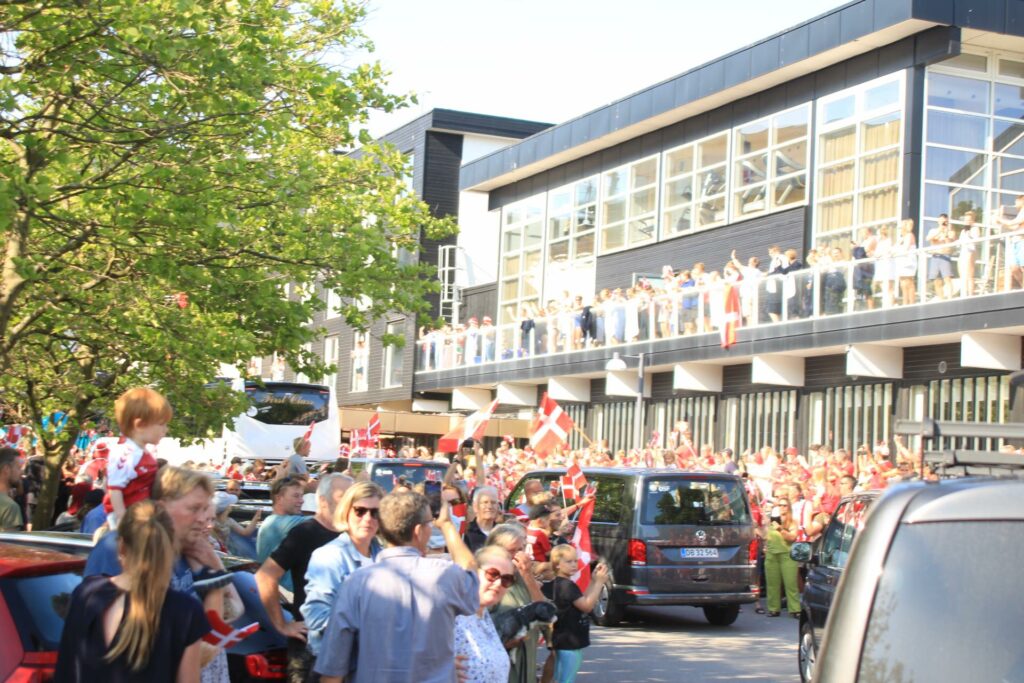 Det danske landshold ankom søndag eftermiddag i Helsingør efter gårdagens kamp, hvor de tog sejren med hjem, og gik videre til semifinalen. I Helsingør blev de modtaget med flag og jublende danske fans.