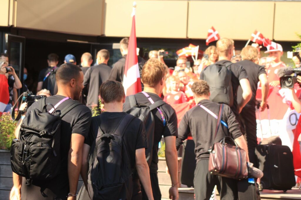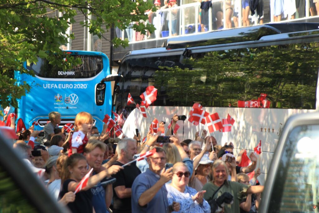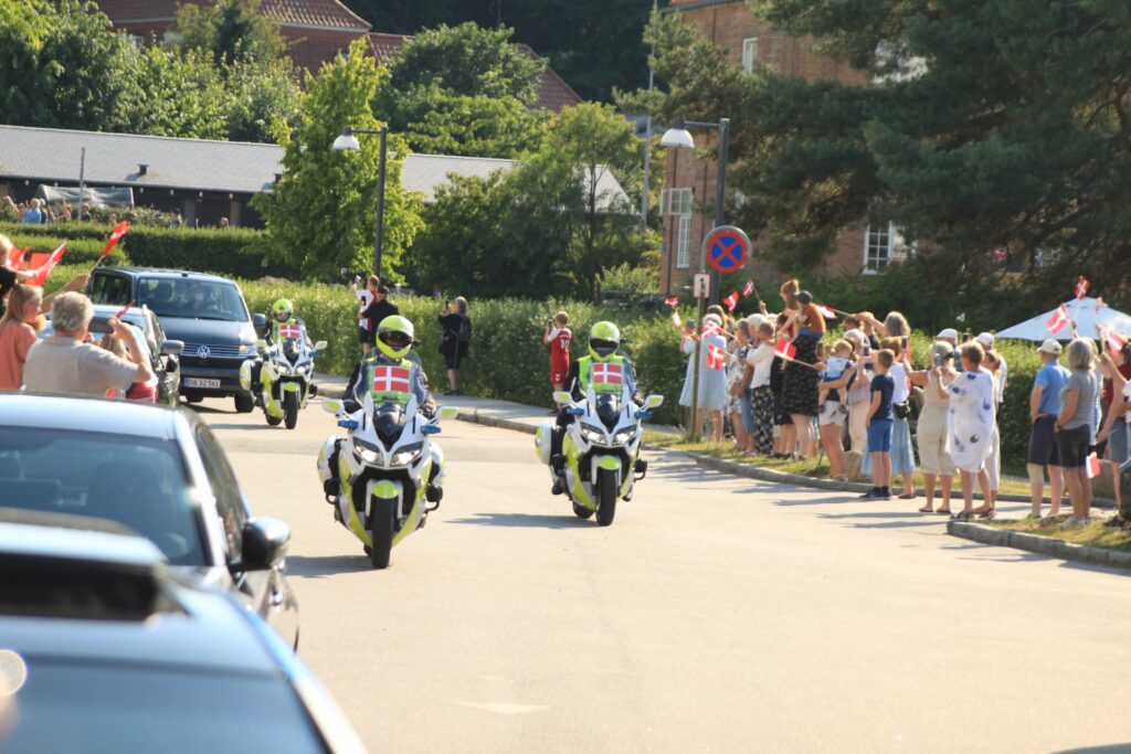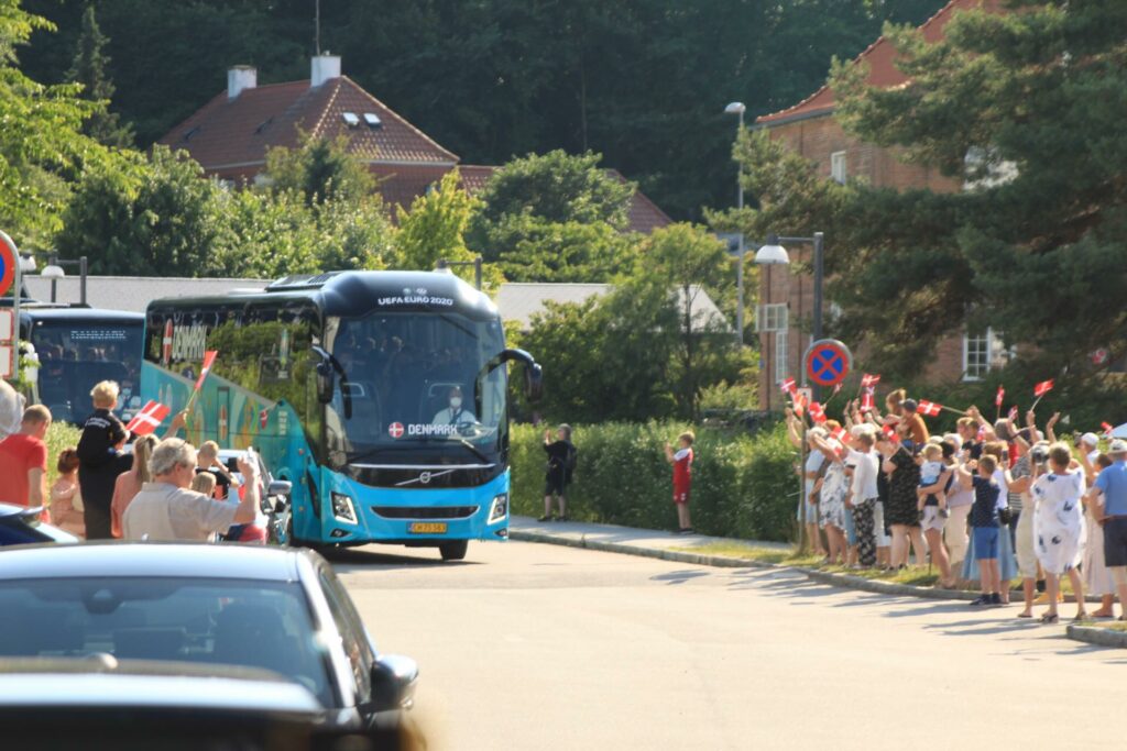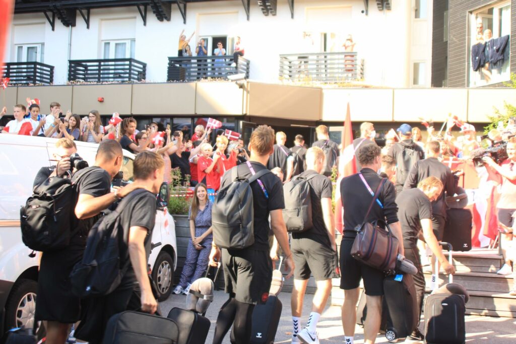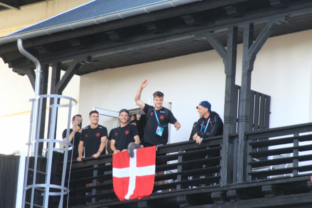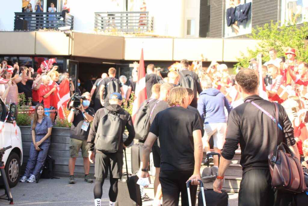 Det danske landshold ankom søndag eftermiddag i Helsingør efter gårdagens kamp, hvor de tog sejren med hjem, og gik videre til semifinalen. I Helsingør blev de modtaget med flag og jublende danske fans.