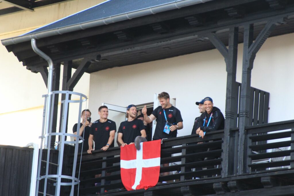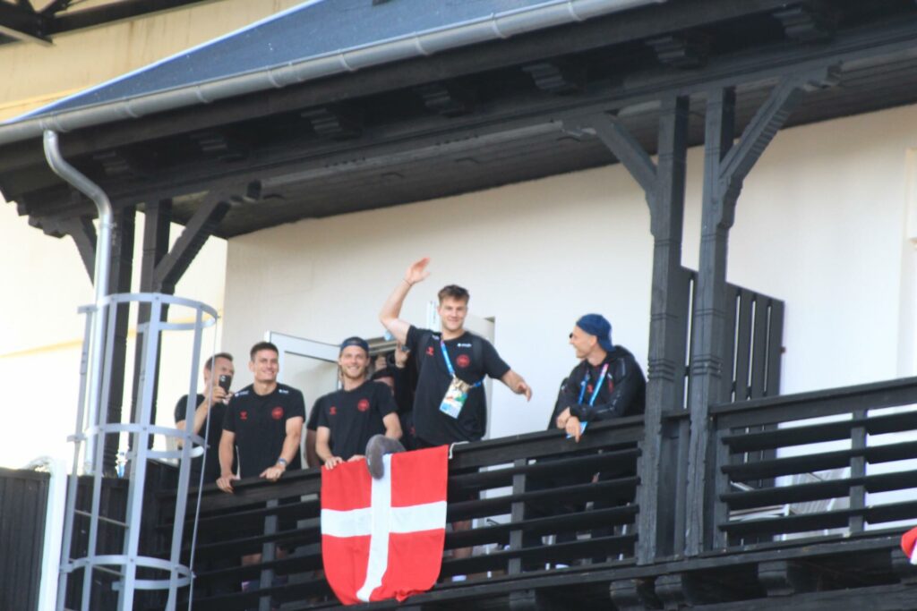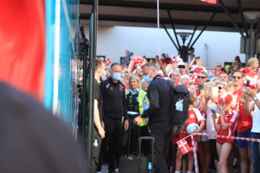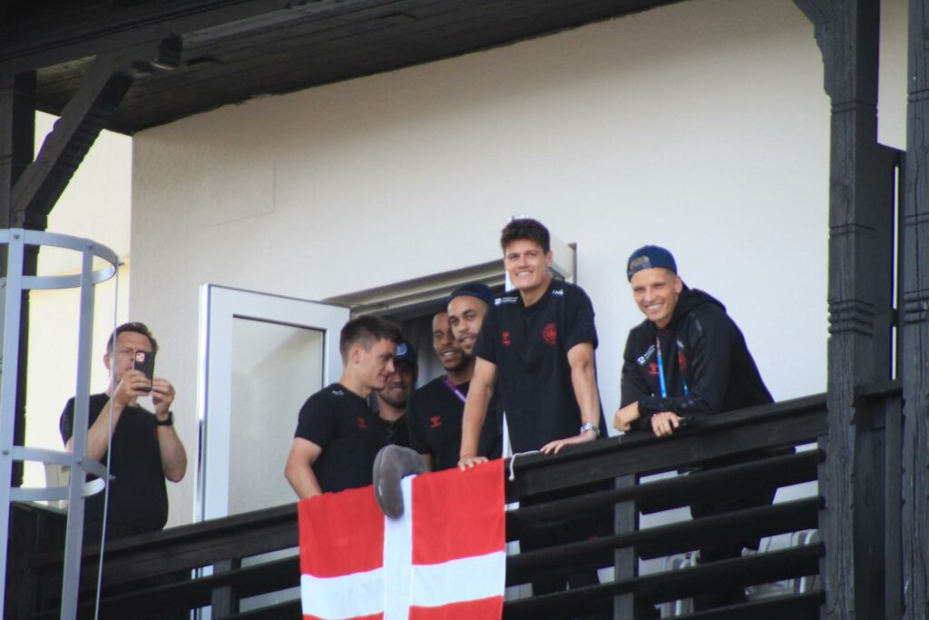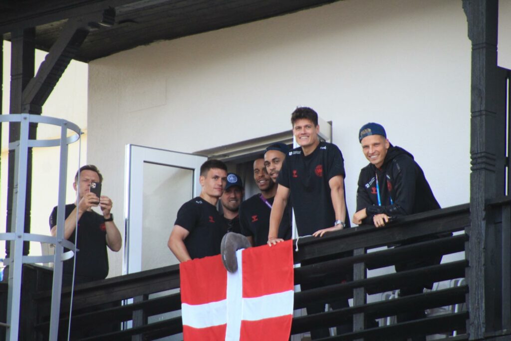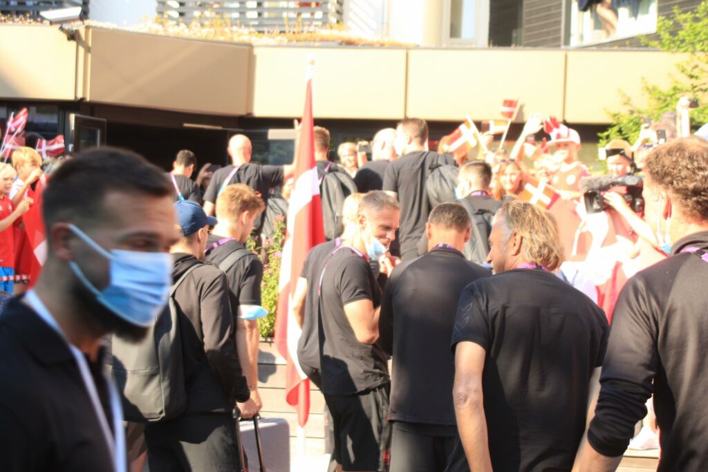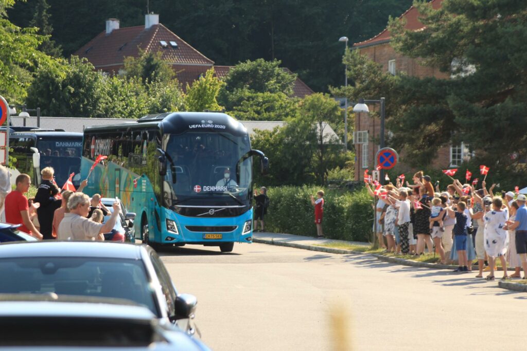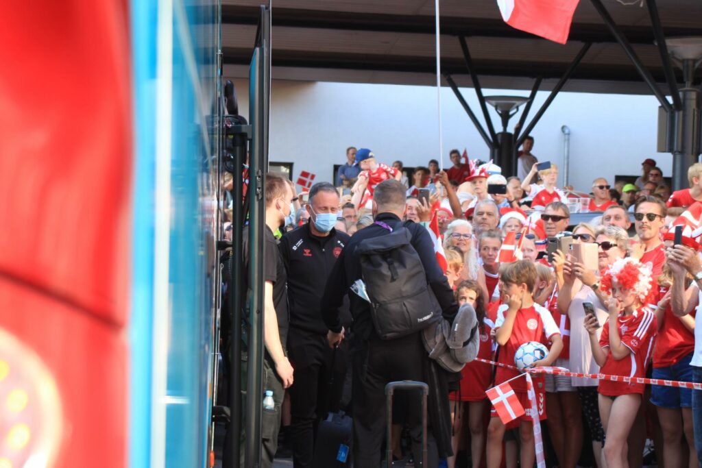 Det danske landshold ankom søndag eftermiddag i Helsingør efter gårdagens kamp, hvor de tog sejren med hjem, og gik videre til semifinalen. I Helsingør blev de modtaget med flag og jublende danske fans.