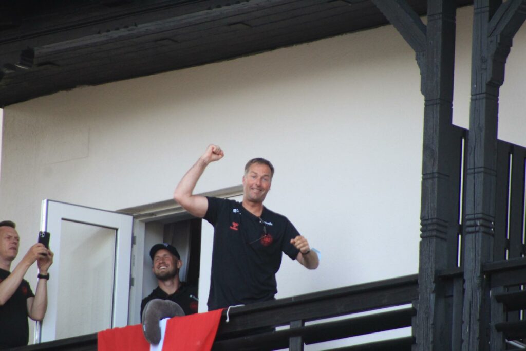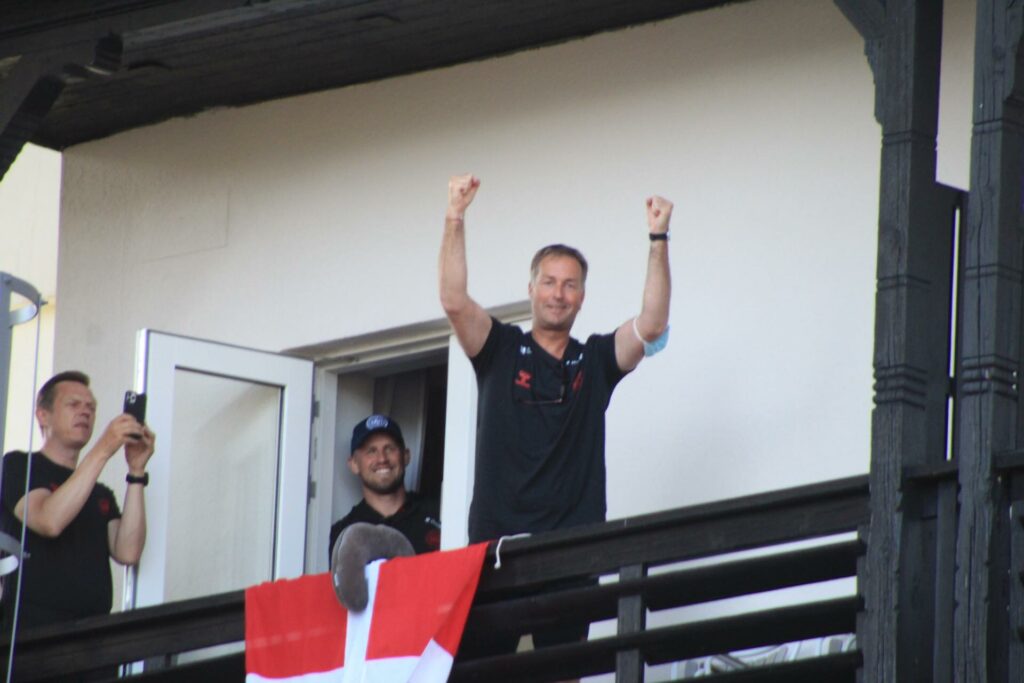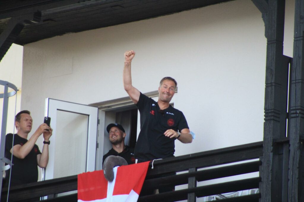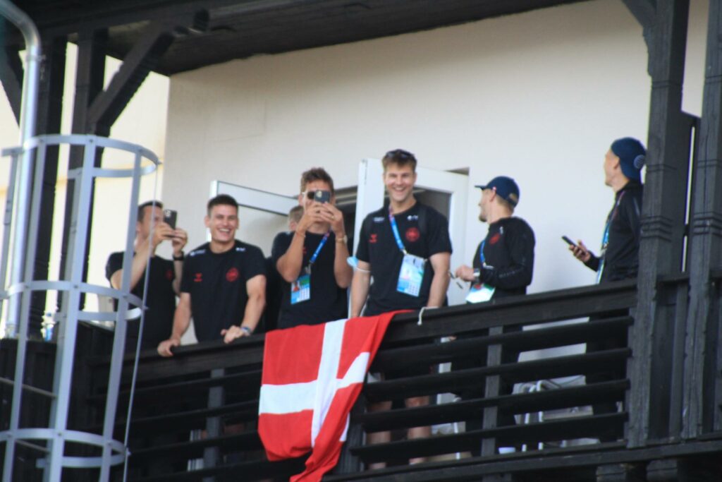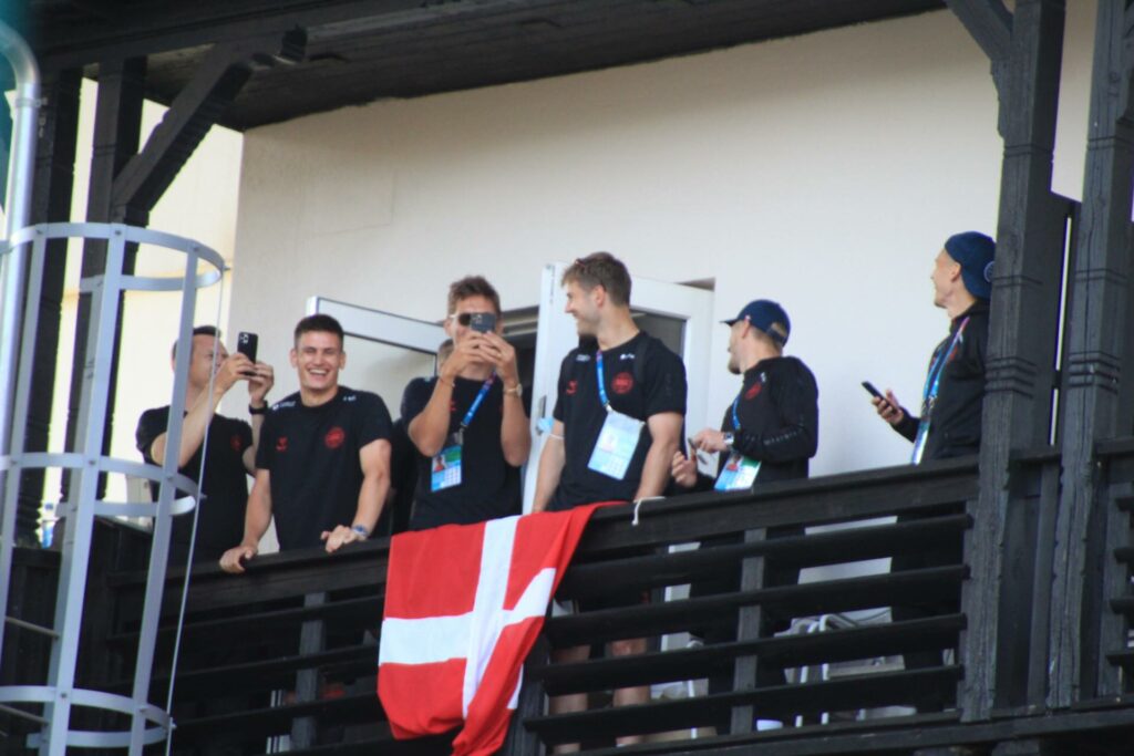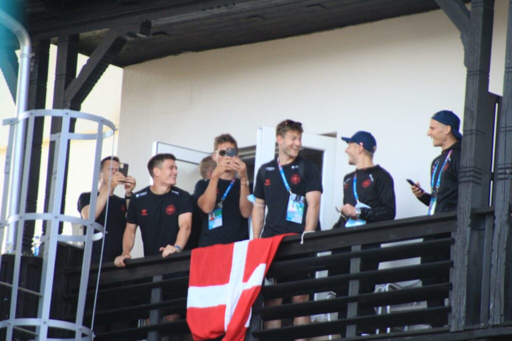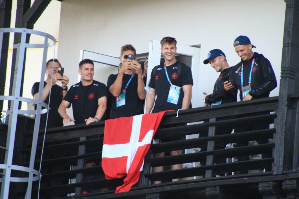 Det danske landshold ankom søndag eftermiddag i Helsingør efter gårdagens kamp, hvor de tog sejren med hjem, og gik videre til semifinalen. I Helsingør blev de modtaget med flag og jublende danske fans.