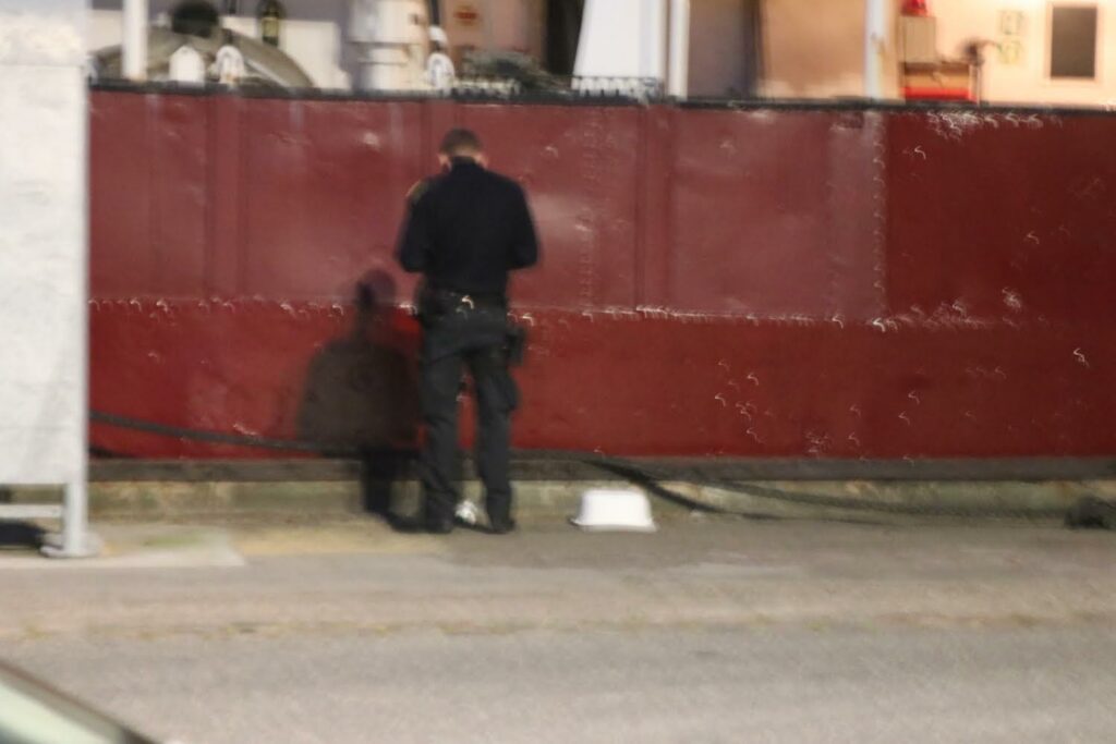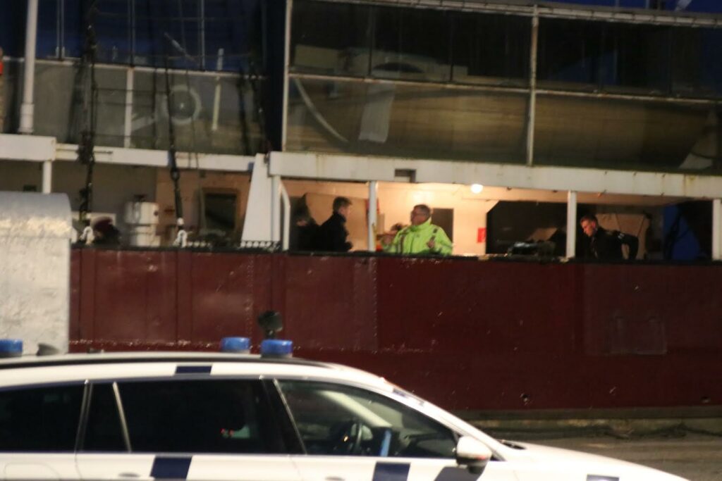 Politiet kunne ved ankomst konstatere, at der var kastet kanonslag mod skibet.