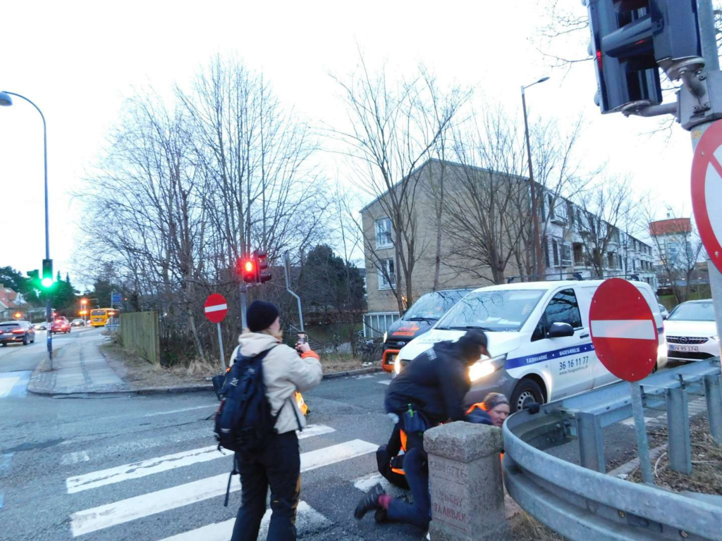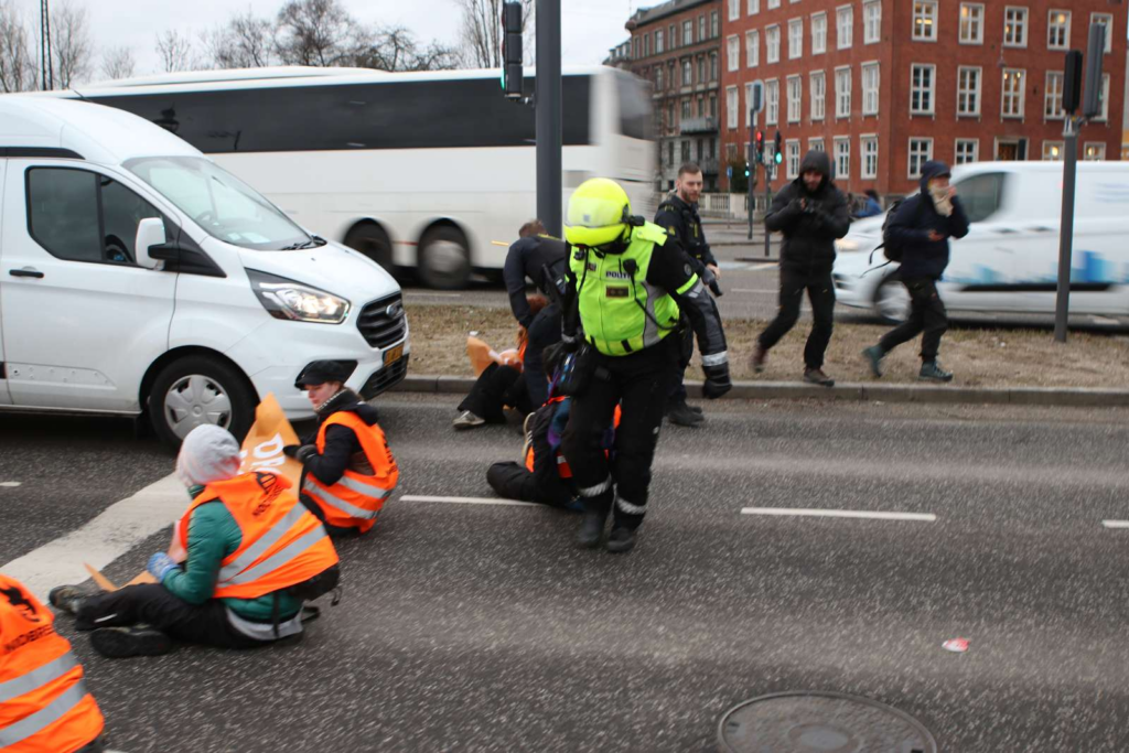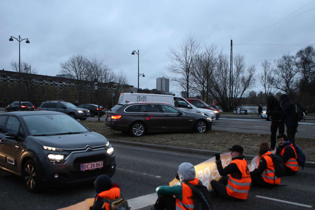 Det gør sig blandt andet gældende på Åboulevarden i det centrale København, hvor klimaaktivisterne spærrer et lyskryds ved at have sat sig på vejen.