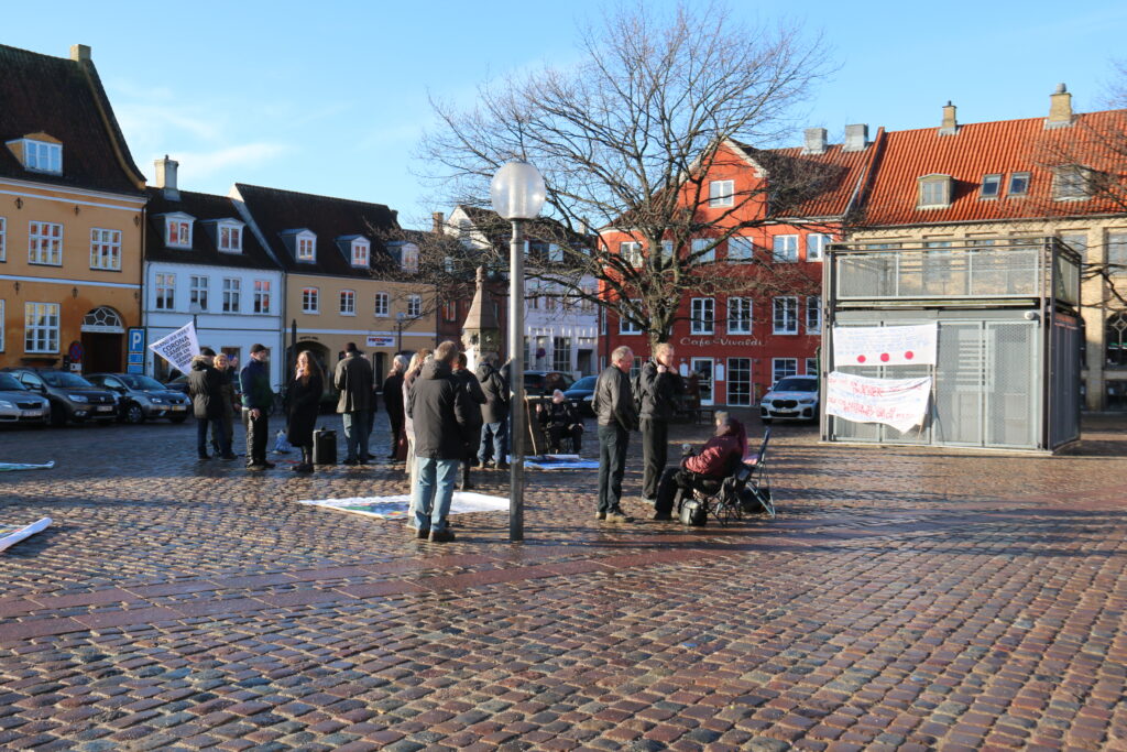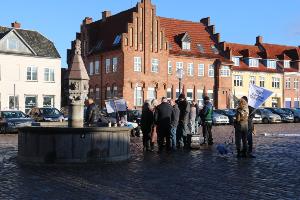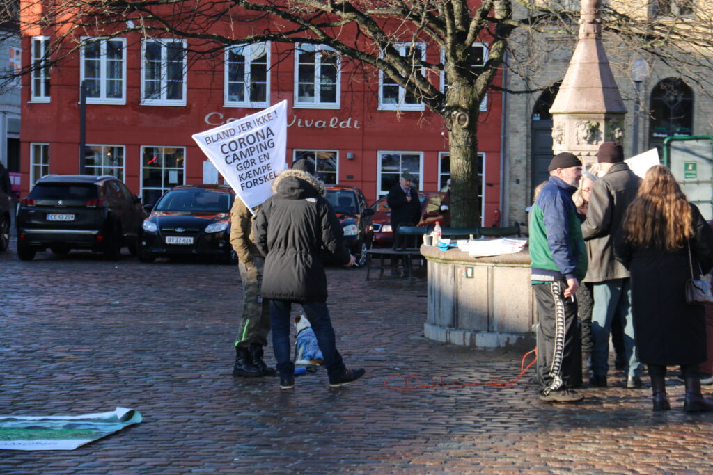 Med slogans som ‘Bland jer ikke! Corona Camping gør en kæmpe forskel’ og ‘Giv os en løsning der ikke dræber’ demonstrerede mellem 30 og 35 personer fredag formiddag klokken 10.0 på Køge Torv.