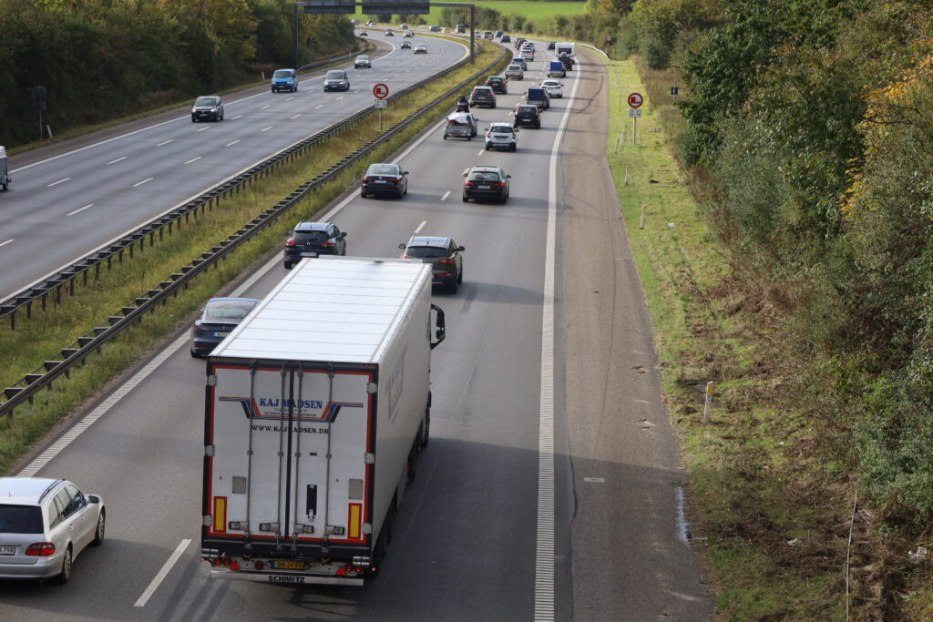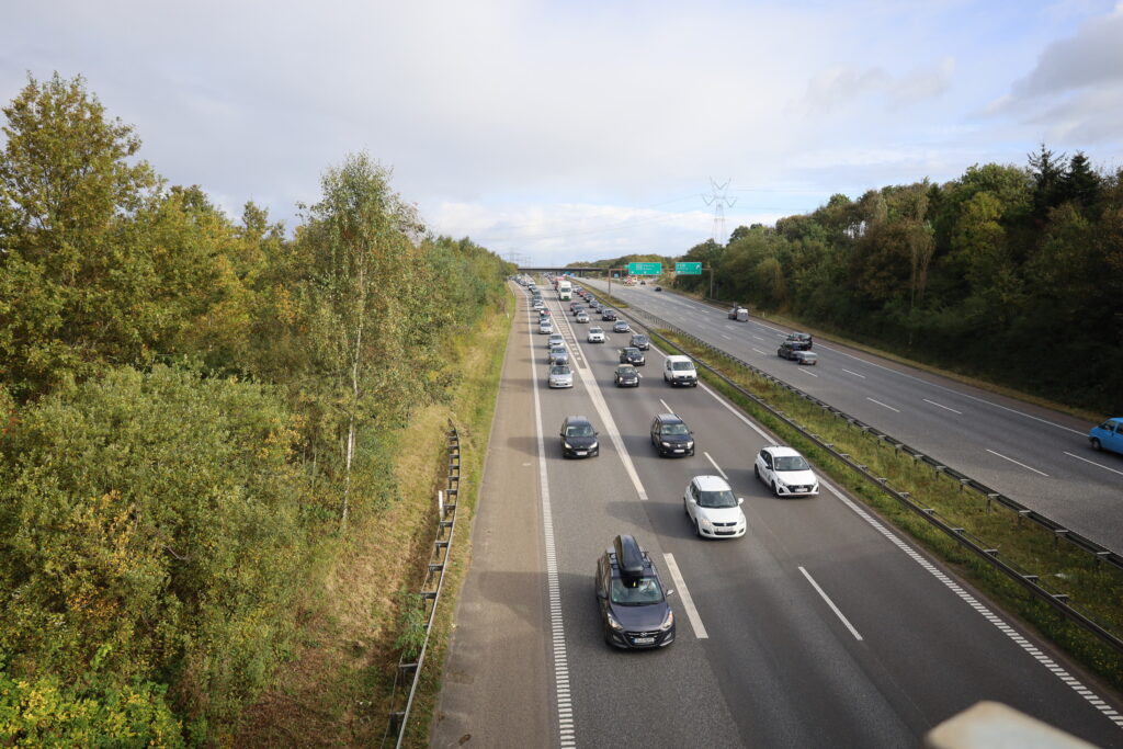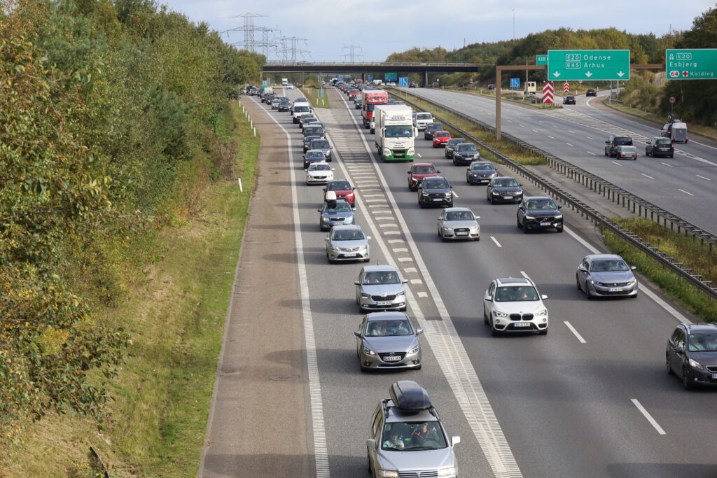Lørdag middag er en længere kø opstået på motorvej E20 fra Vejle mod Kolding V, mellem serviceanlæg Harde og motorvejkryds Kolding V.