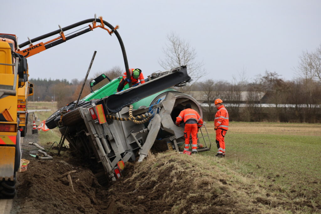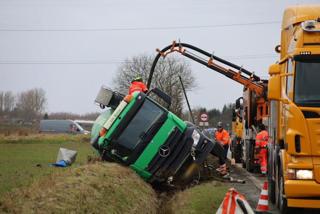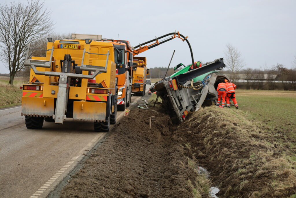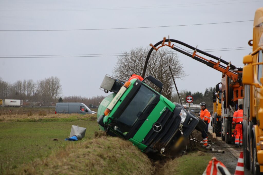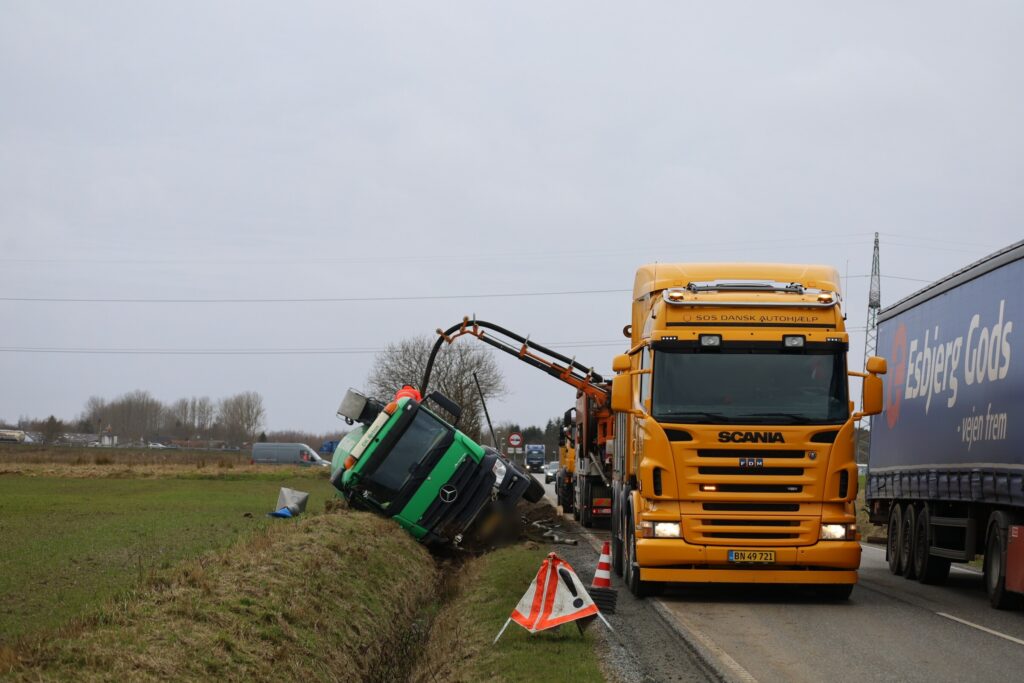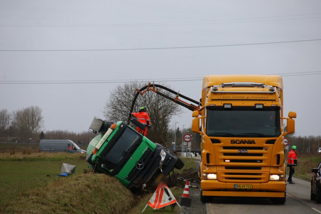 En lastbil er tirsdag væltet ned på siden i en grøft på Ødisvej i Kolding.