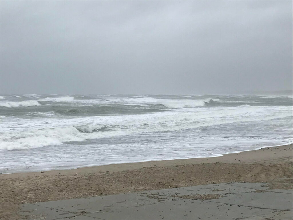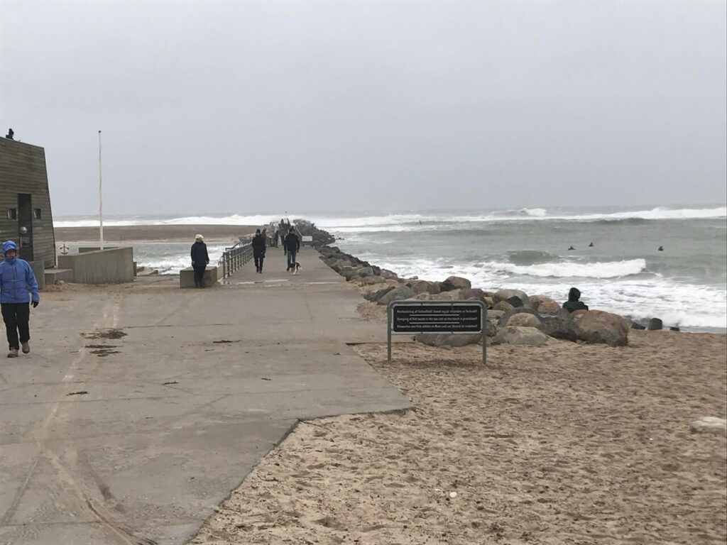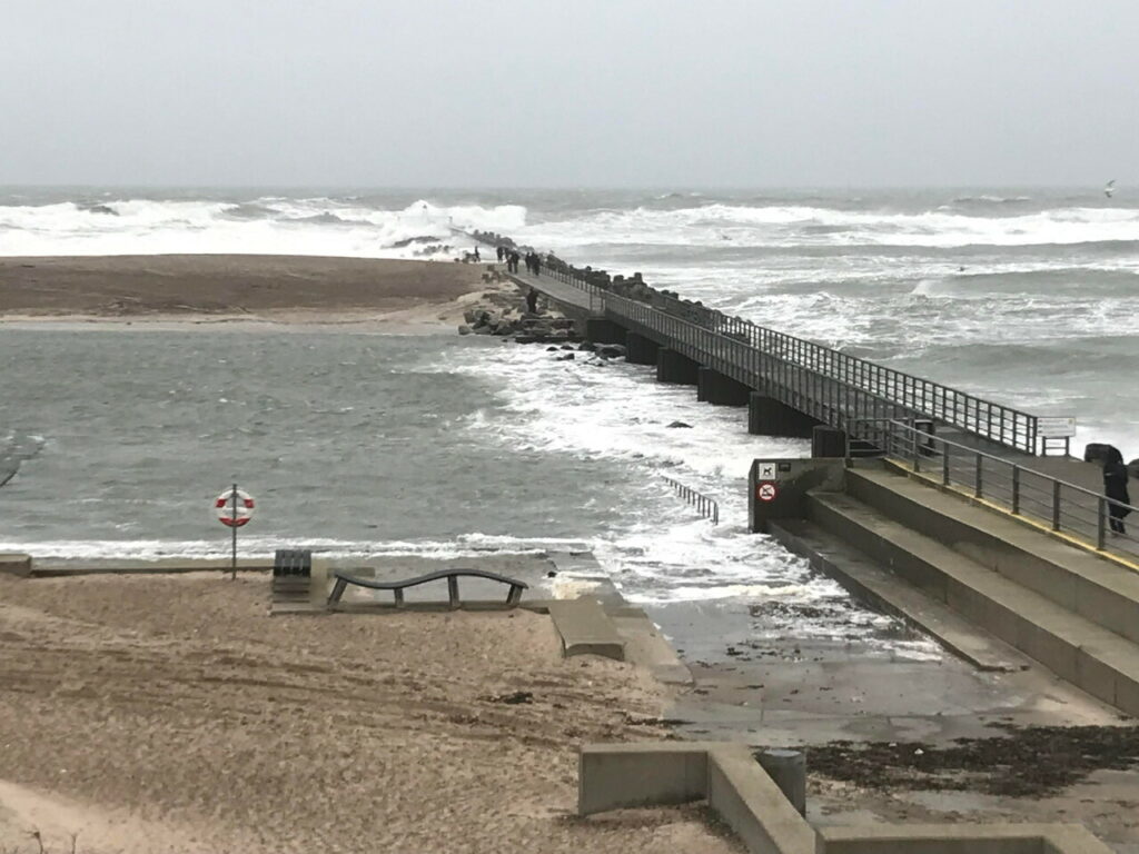 I Vorupør slår bølgerne hårdt ind over stranden og molen lørdag eftermiddag.