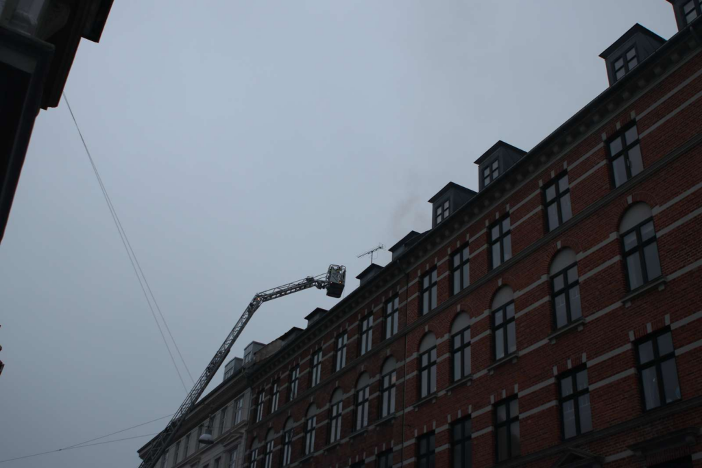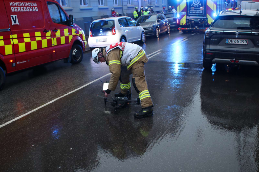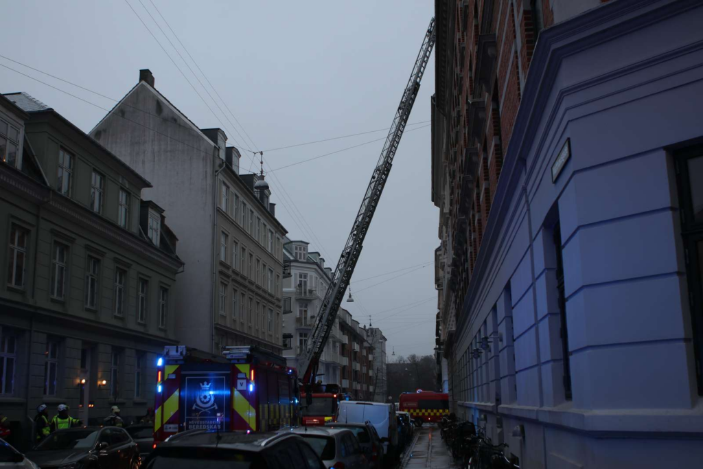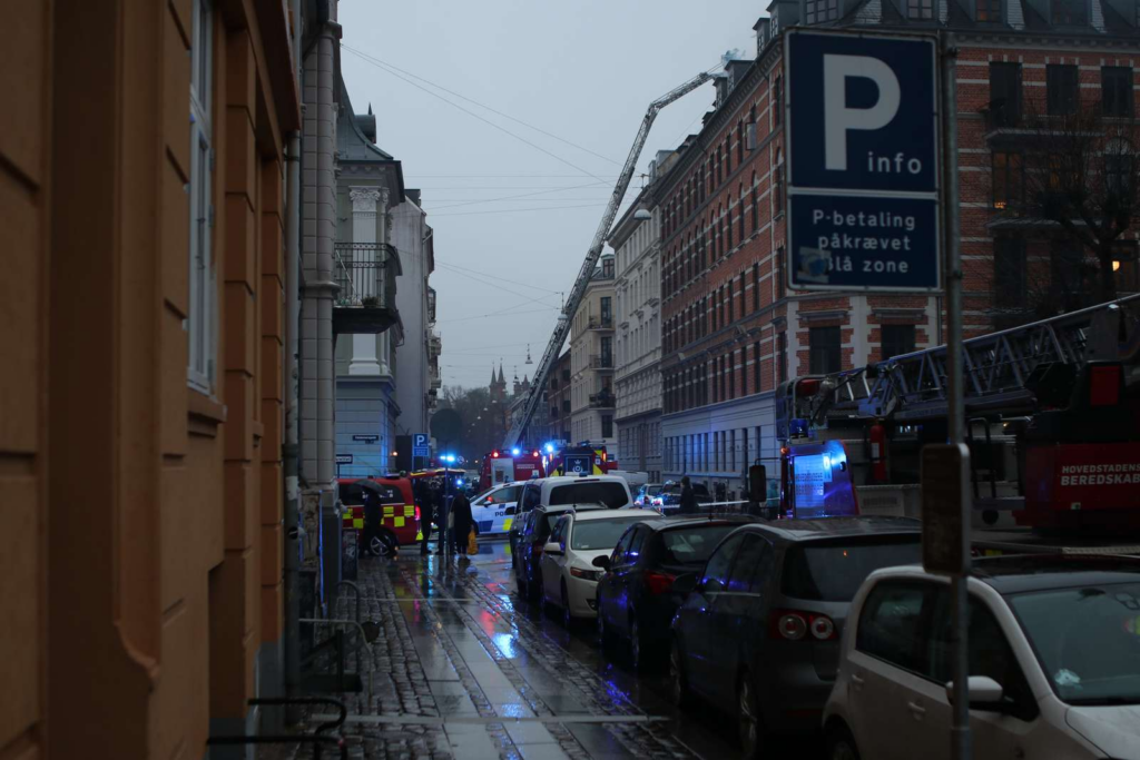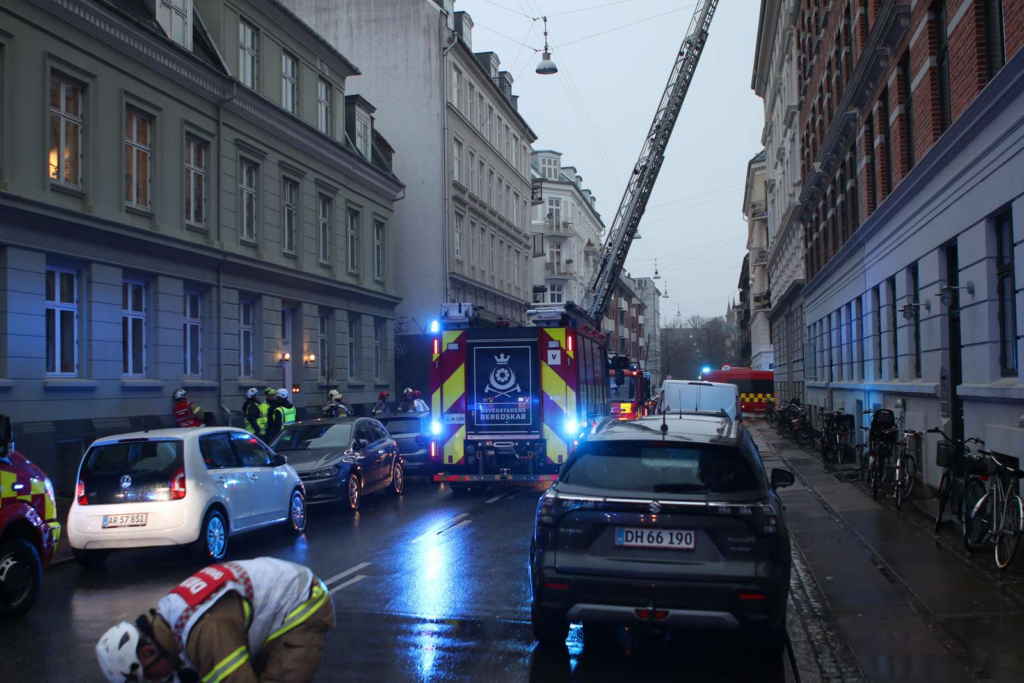 Der er mange udrykningskøretøjer på Mathæusgade i København og Hovedstadens Beredskab opfordrer alle til at søge væk fra røgfanen.
