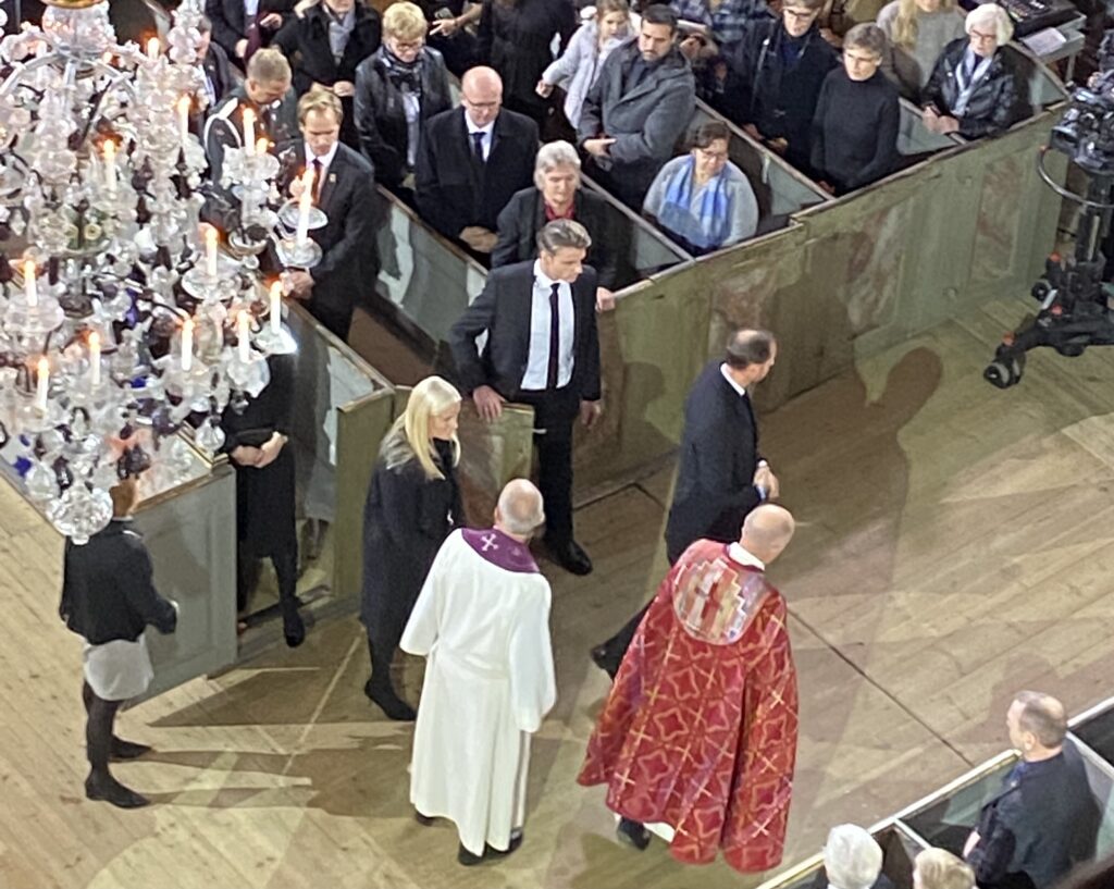Søndag formiddag var den norske kronprinsfamilie bestående af Norges kronprins Haakon og kronprinsesse Mette-Marit til stede ved en større mindehøjtidelighed i Kongsberg Kirke, som afholdes for ofrene efter den voldsomme tragedie som i sidste uge fandt sted foran og i en Coop-butik i Kongsberg i Norge.