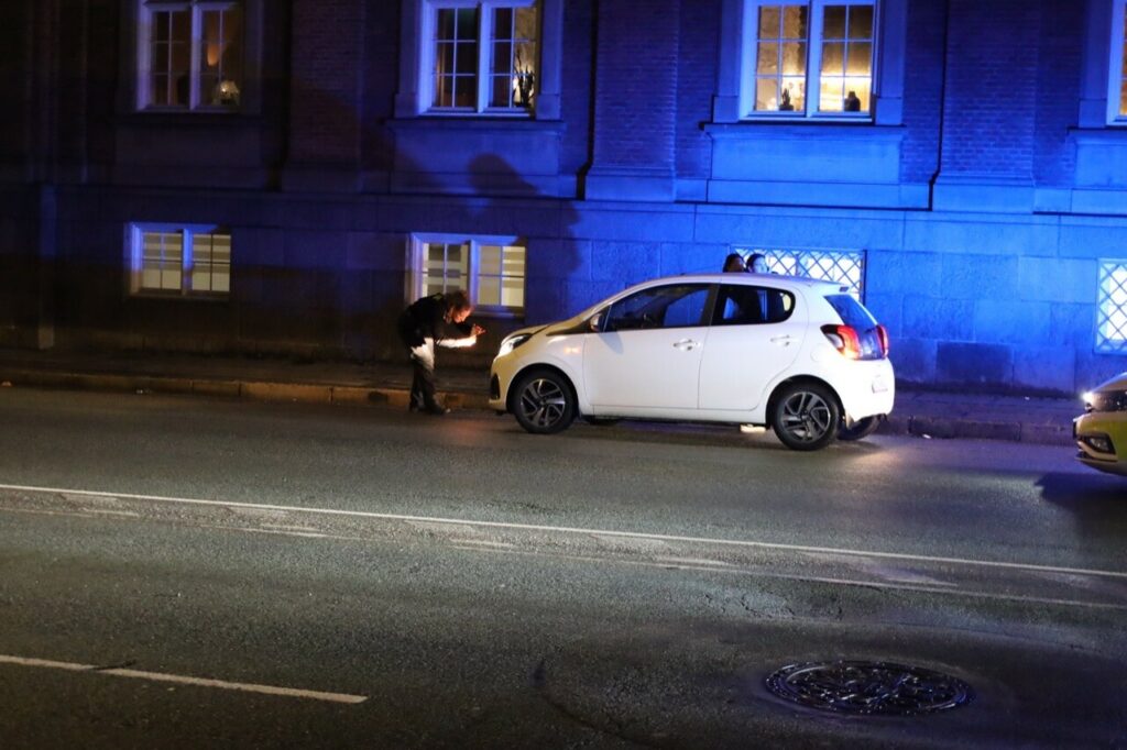 Betjente med lygter gik og lyste på en lille personbil og en læge samt ambulancefolk arbejdede i ambulancen.