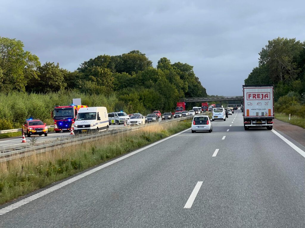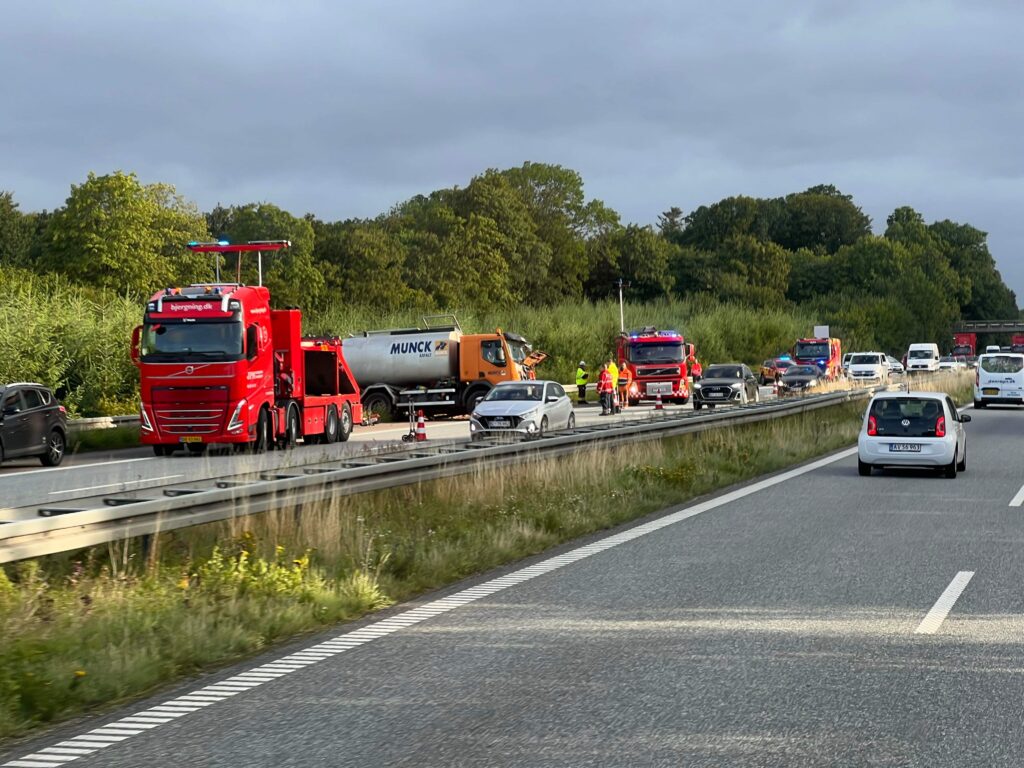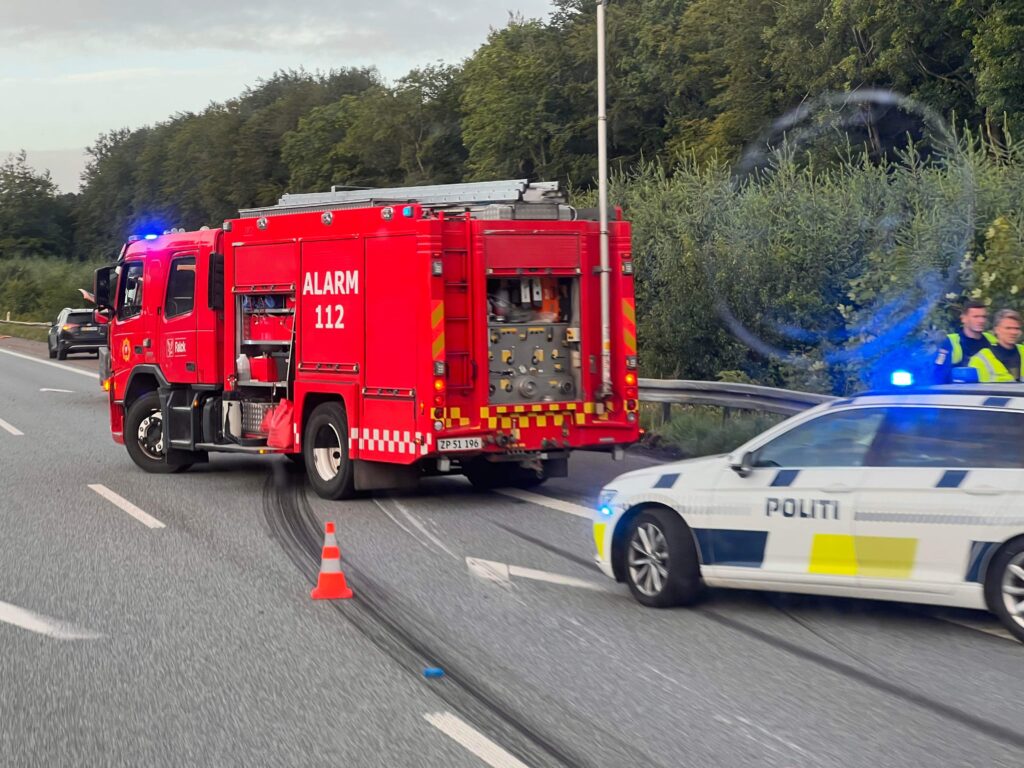 Redningsmandskabet er fremme på stedet hvor oprydningsarbejde lige nu er i gang. Uheldet kan have betydning for trafikken det er lastbilen holder halvvejs ude på vejbanen.