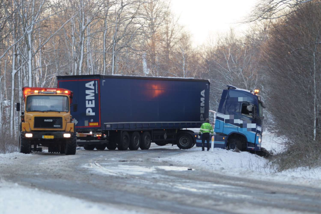 Under uheldet er lastbilen skredet af vejen på den glatte kørebane og sat sig fast nede i grøften.