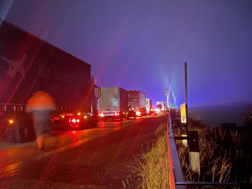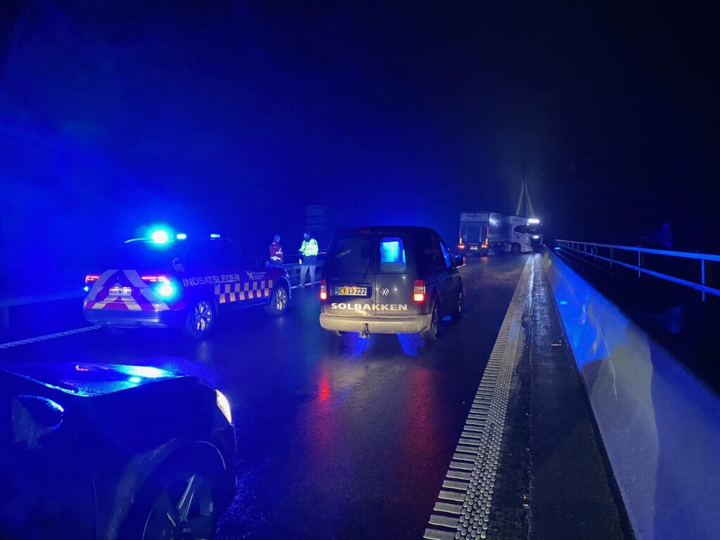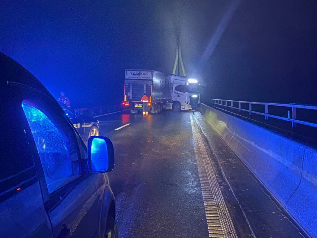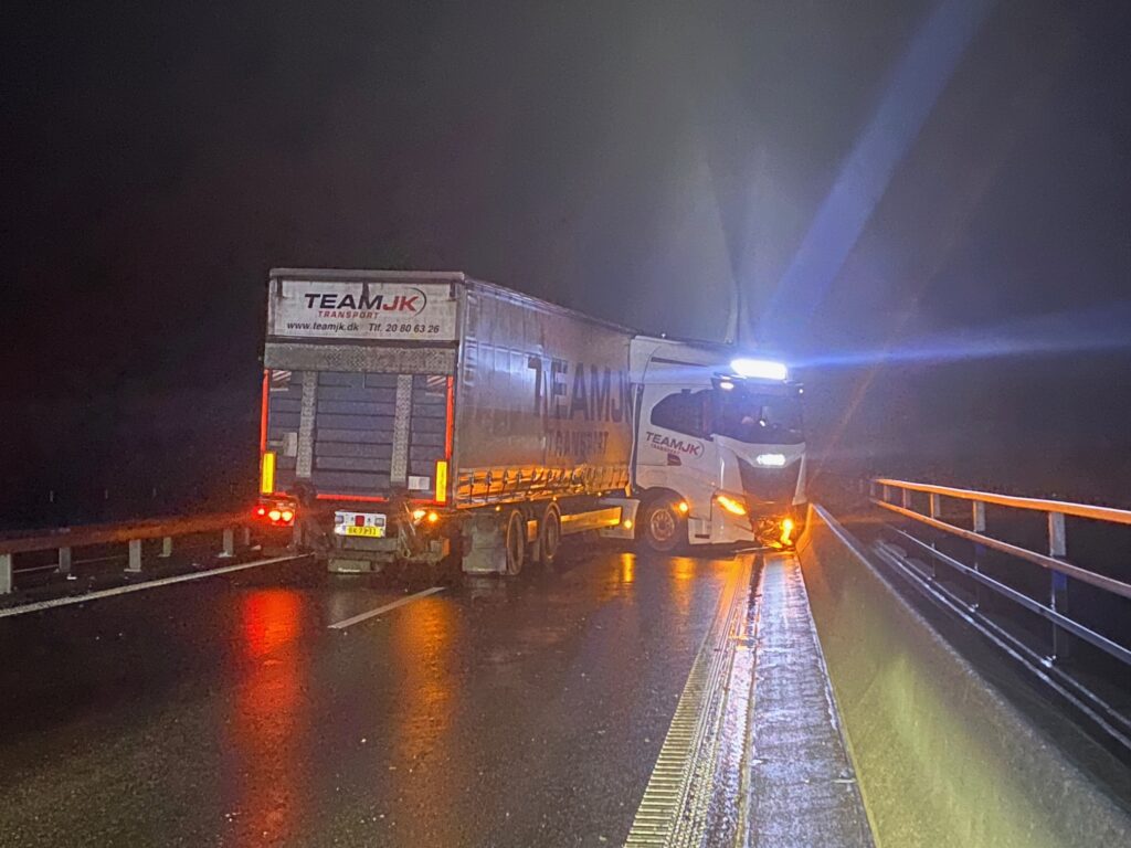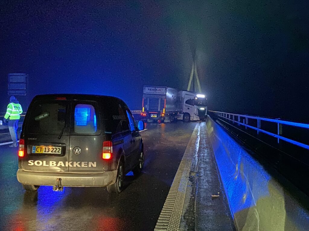 En lastbilchauffør mistede natten til torsdag herredømmet over sin lastbil på Farøbroen grundet isslag.