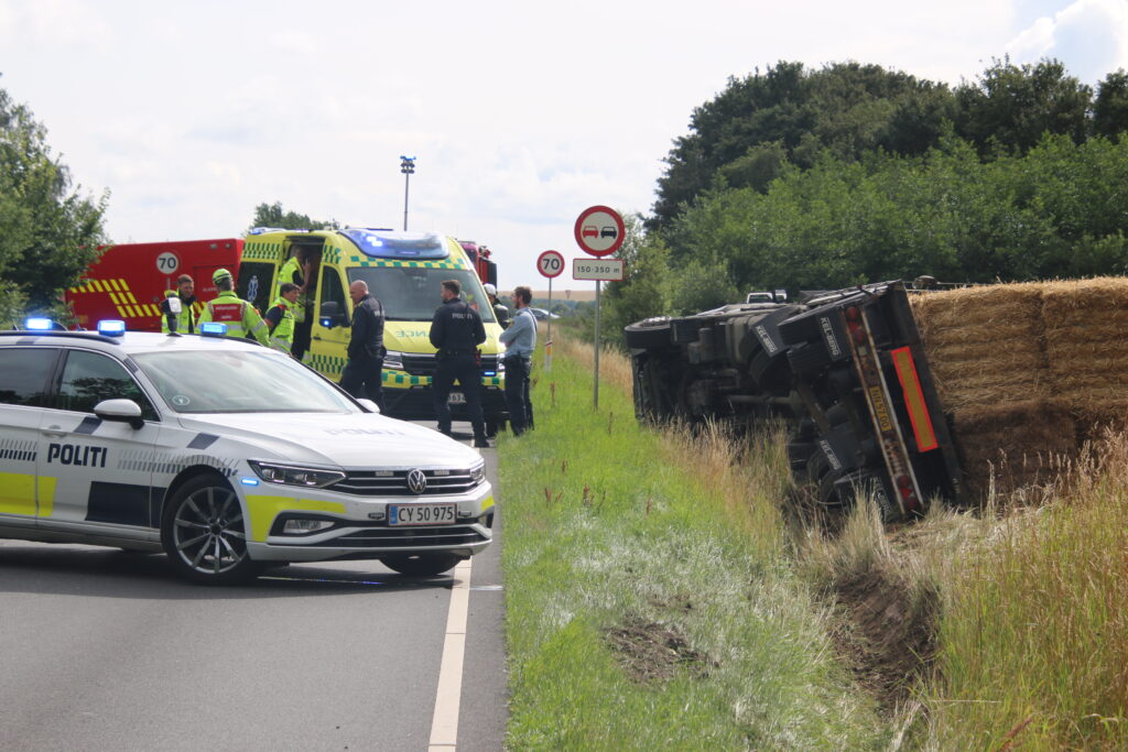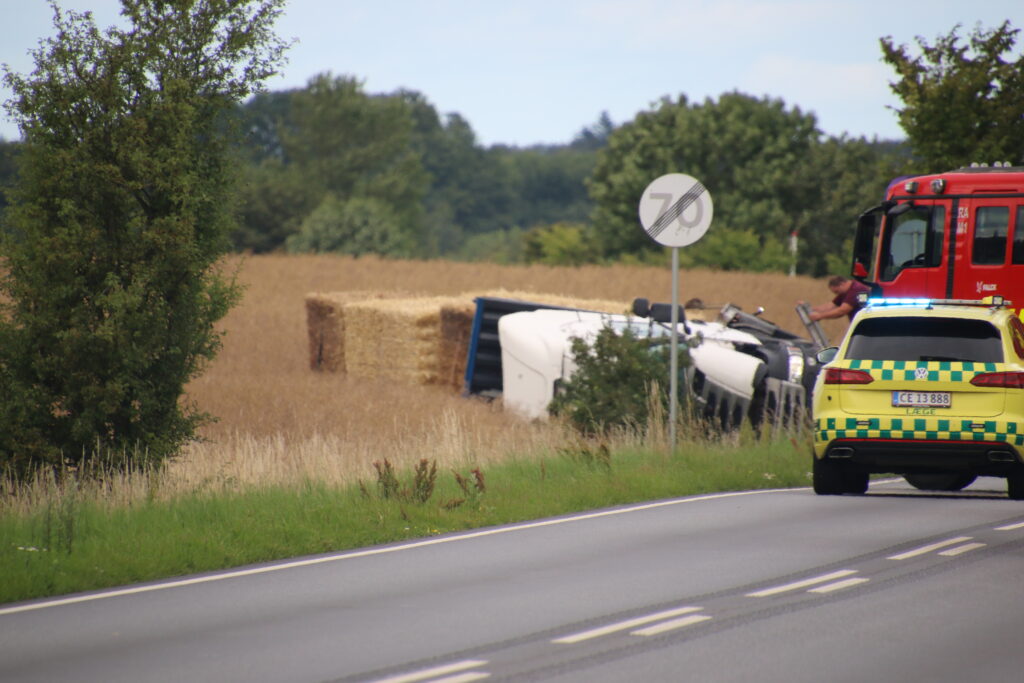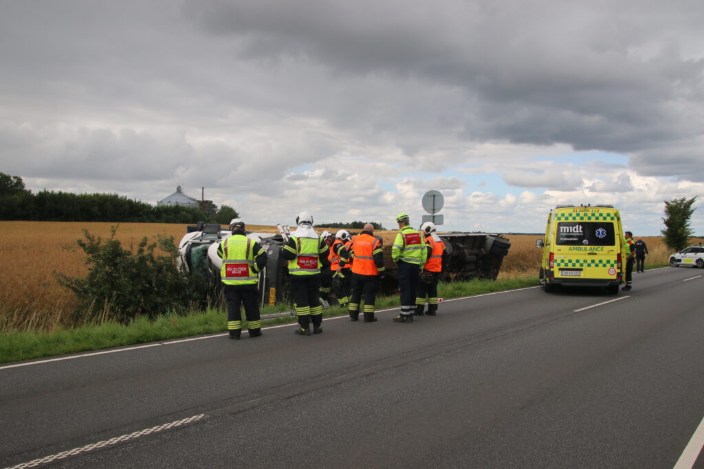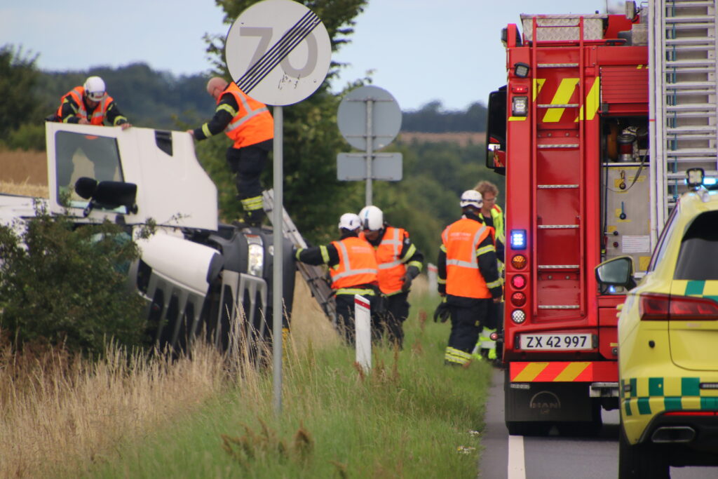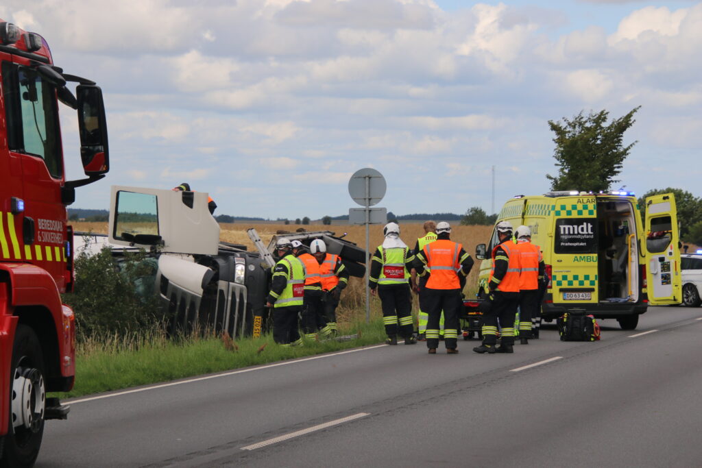 Her er en lastbil væltet om på siden, og derfor er ambulance og læge ankommet til stedet.