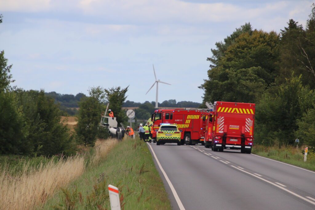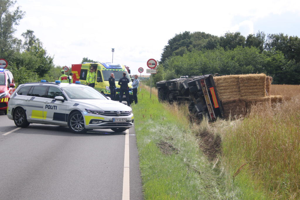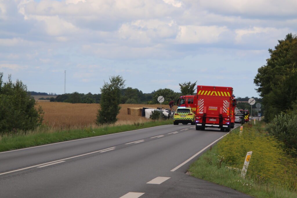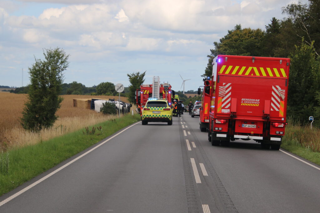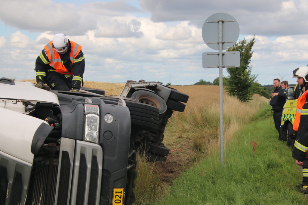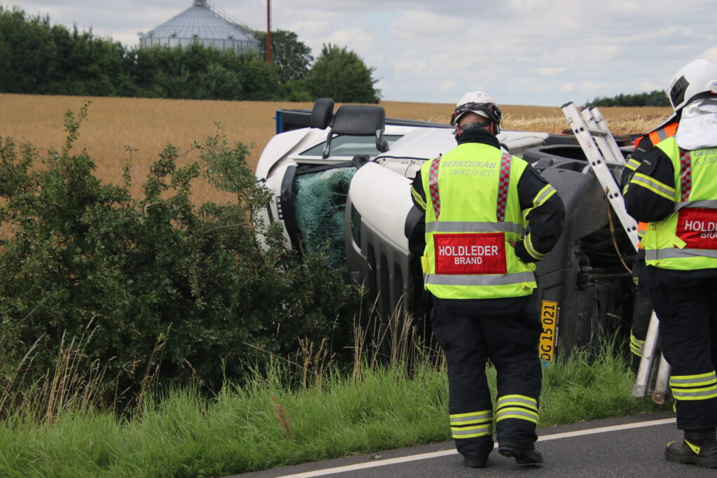Her er en lastbil væltet om på siden, og derfor er ambulance og læge ankommet til stedet.