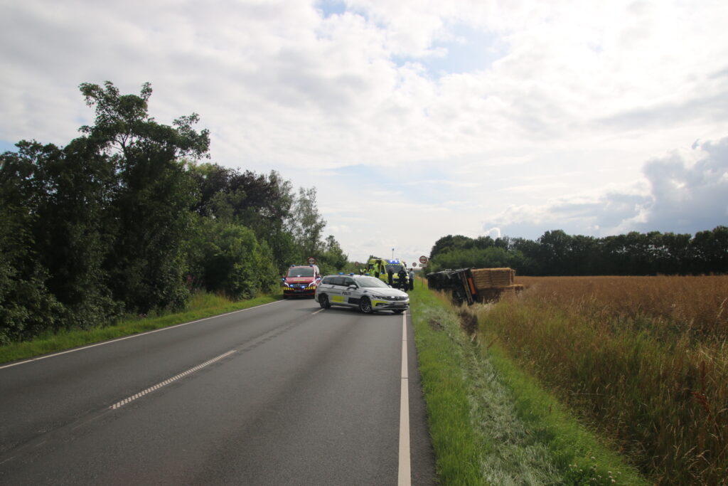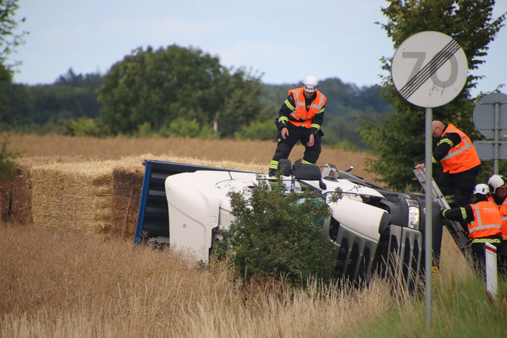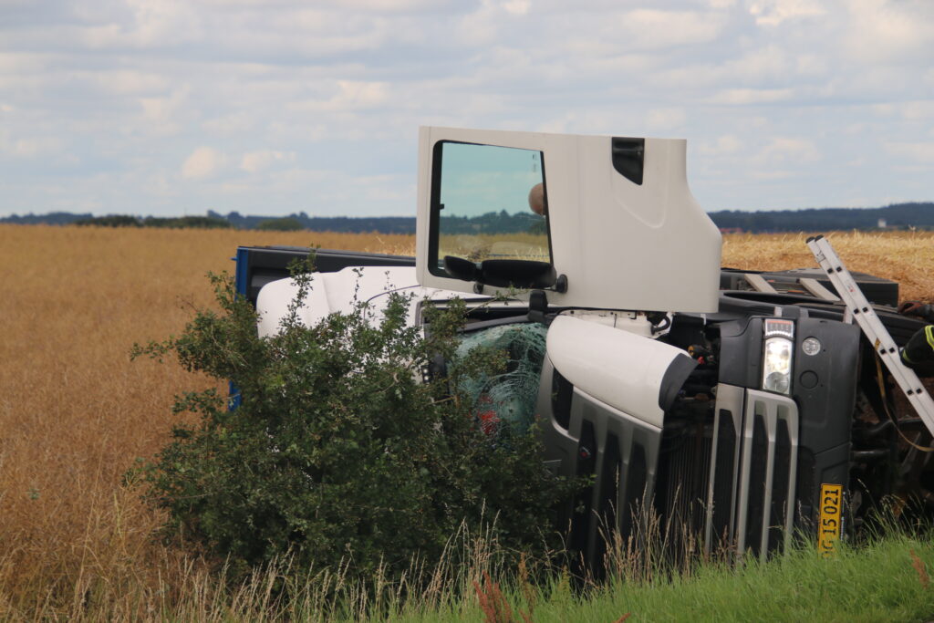 Vidner fortæller, at man netop har fået chaufføren ud af det væltede køretøj. Der er tale om tilskadekomst i forbindelse med uheldet, og chaufføren er blevet hastet til hospitalet.