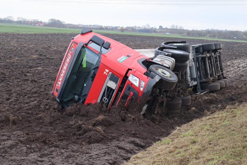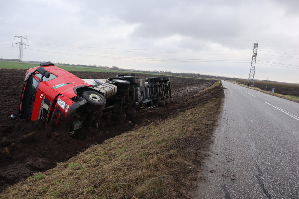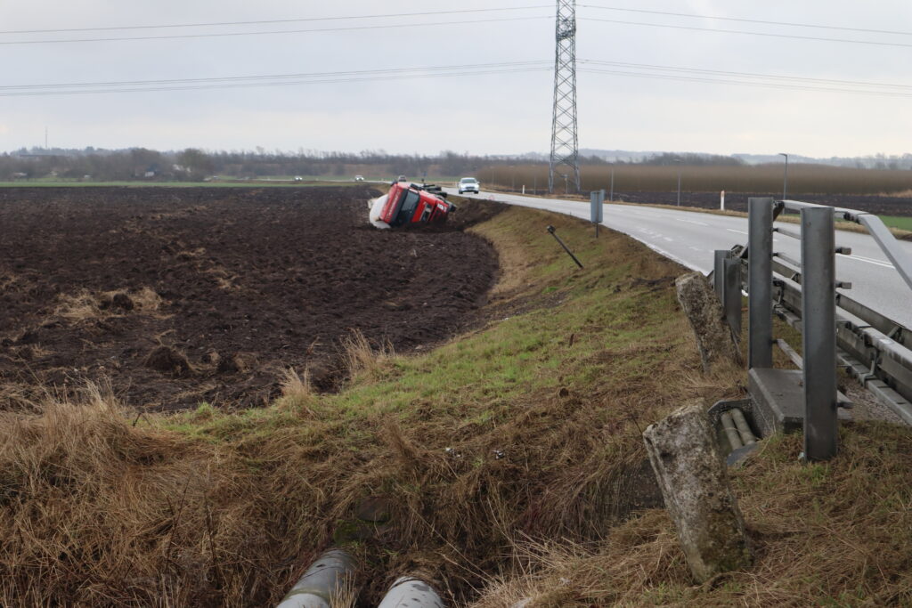 En lastbil er søndag væltet ud på en mark på Klarupvej i Aalborg.