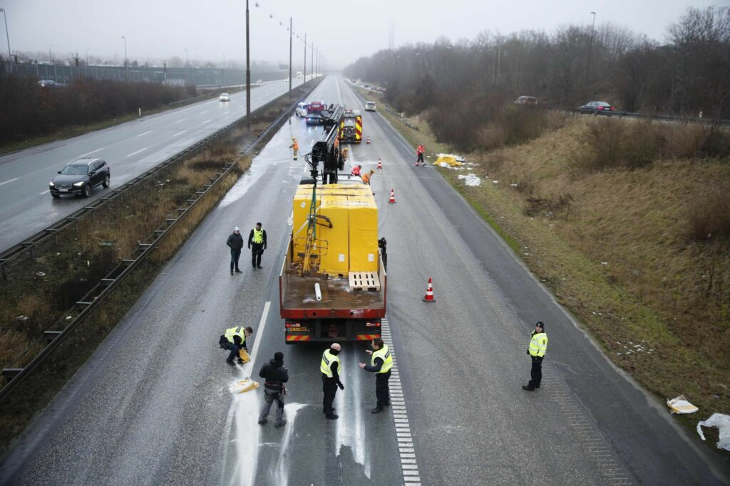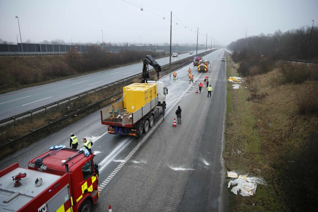 Motorvejen vil fortsat være spærret indtil oprydningsarbejdet på vejen er færdigt.