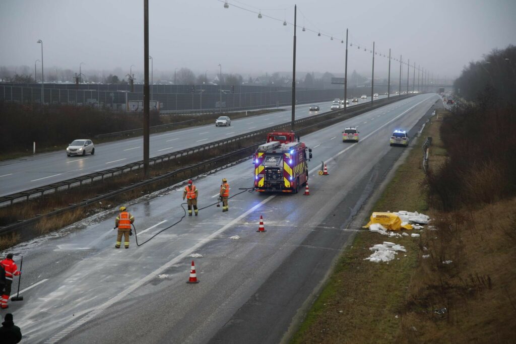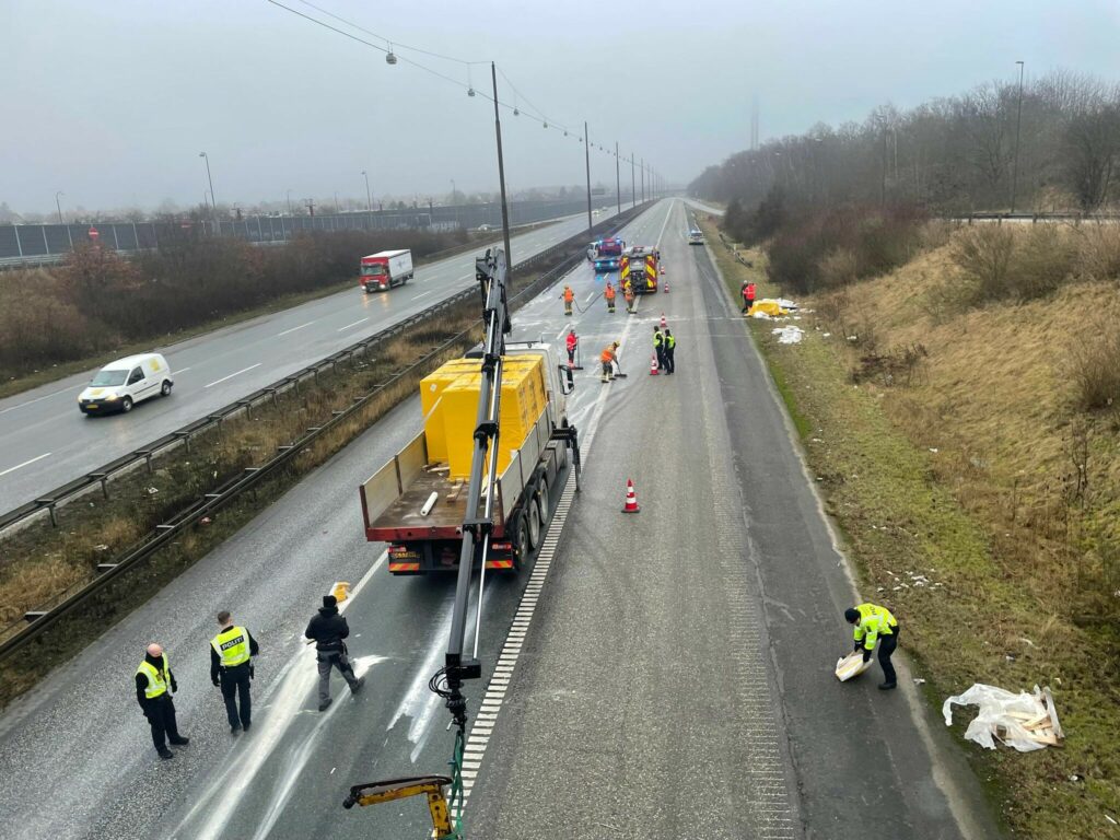 Holbækmotorvejen helt spærret ved afkørsel 1 Hvidovre. Massiv kø. Lastbilulykke