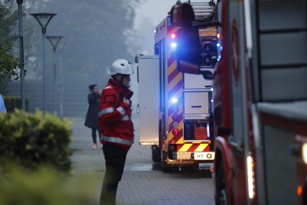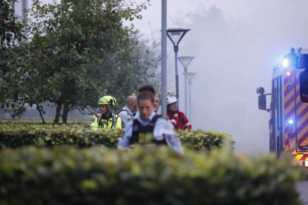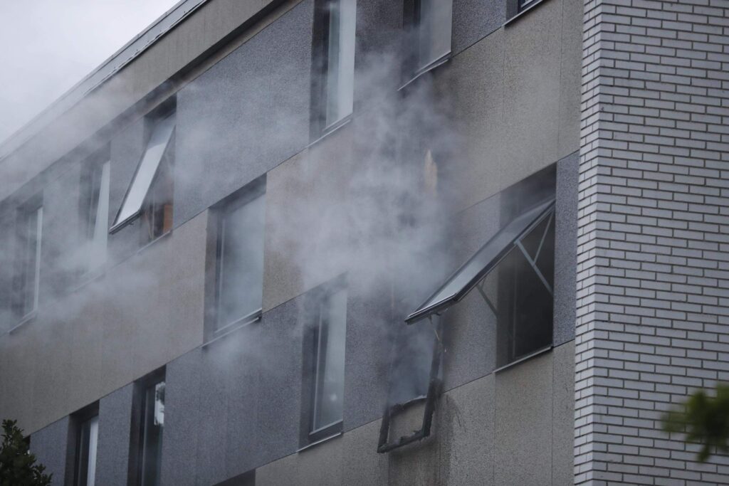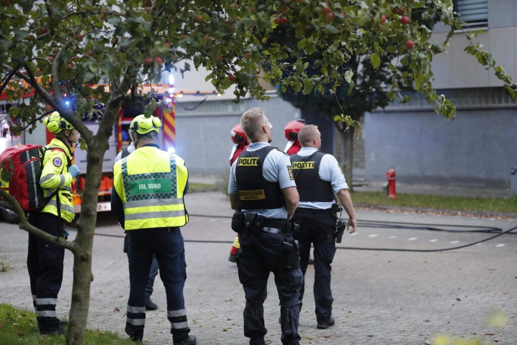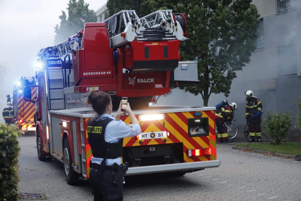 Politiet, brandvæsnet samt ambulancer og læge er talstærkt til stede. Alle er ude af lejligheden og brandvæsnet er igang med slukningsarbejdet.