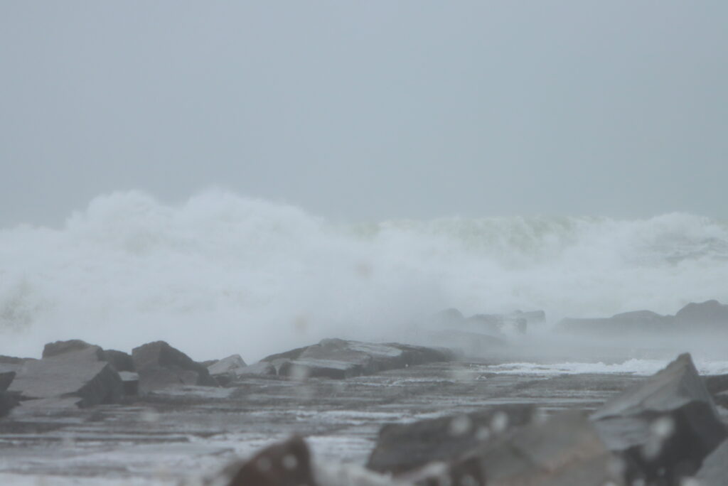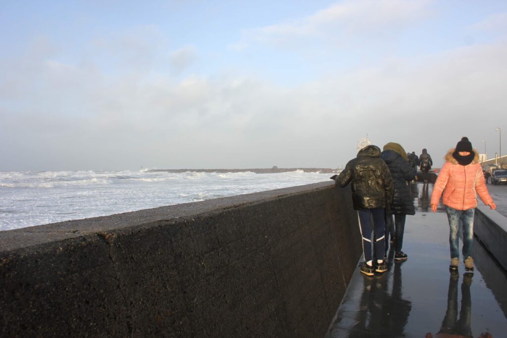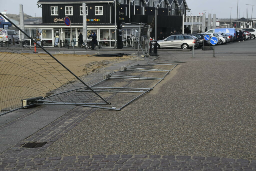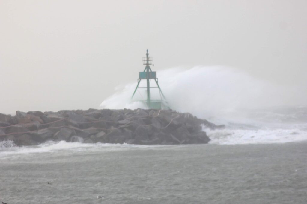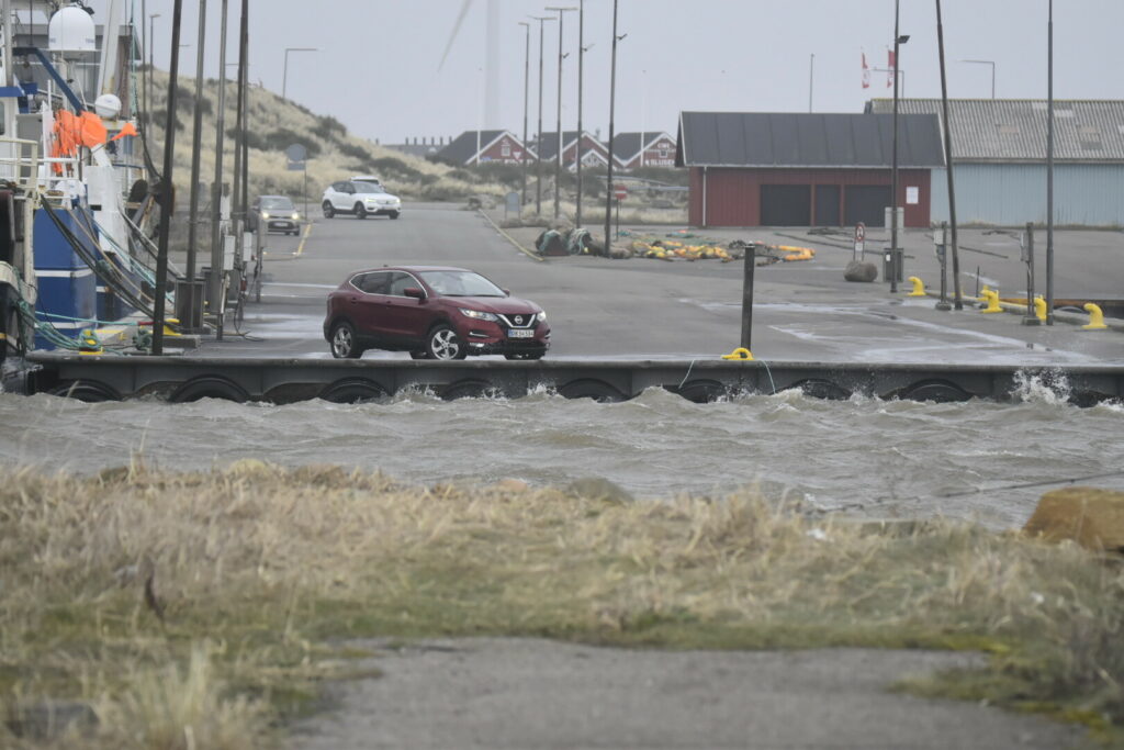 Vandet pisker ind over molerne og folk bør holde sig fra farebare områder.