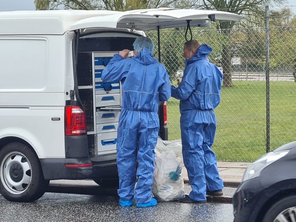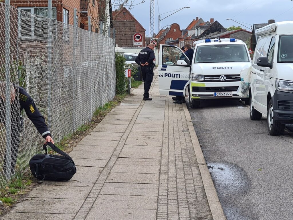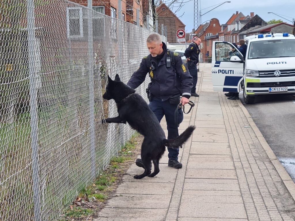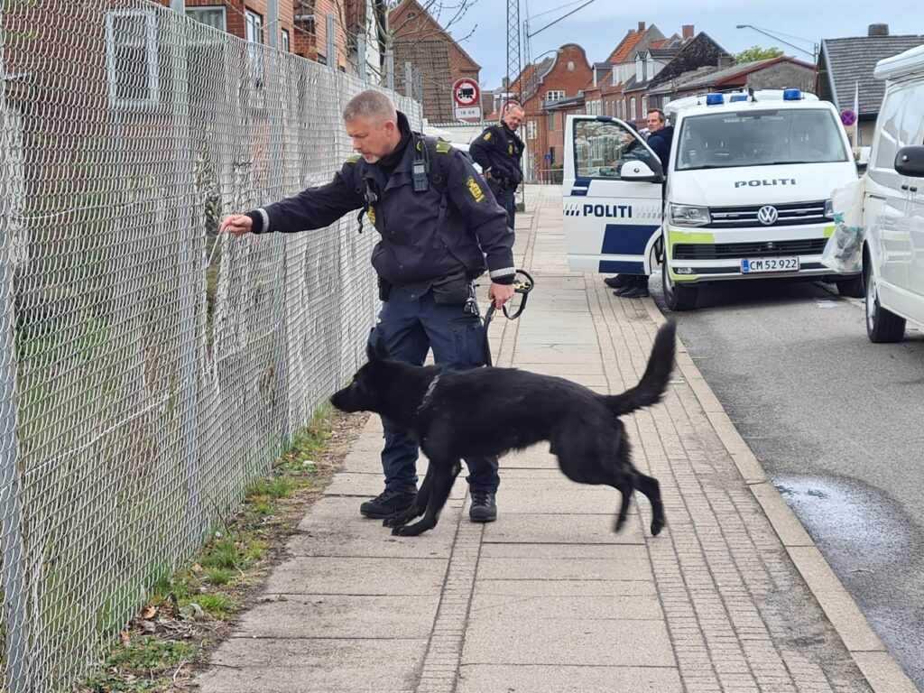 Omkring et hus til salg på Langmarksvej er der adskillige politibiler, betjente og hunde.