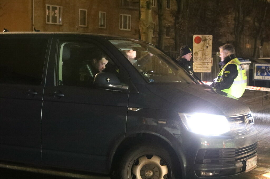 Mellem biler og et lavt etagebyggeri arbejder politiet med hunde, og der er udlagt flere markeringer på jorden.