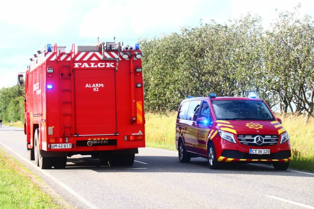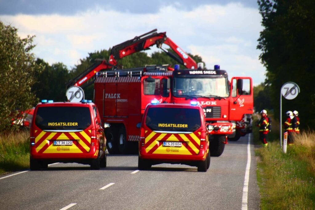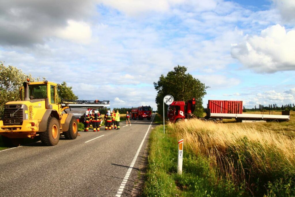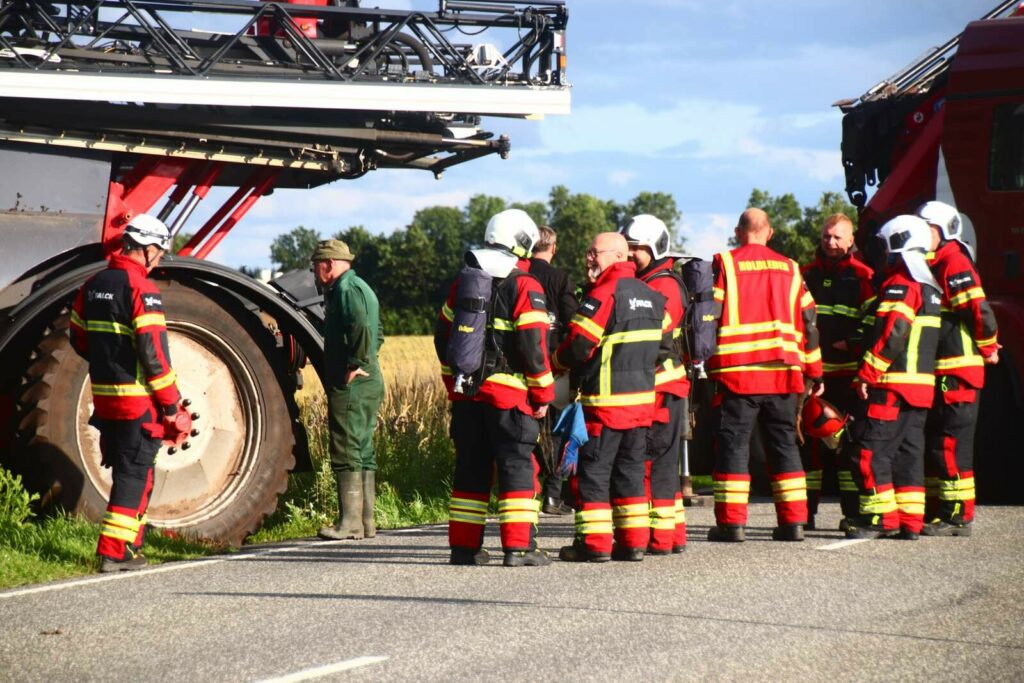 Vejen er afspærret, mens brandfolkene får rejst marksprøjten op.