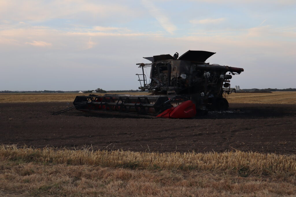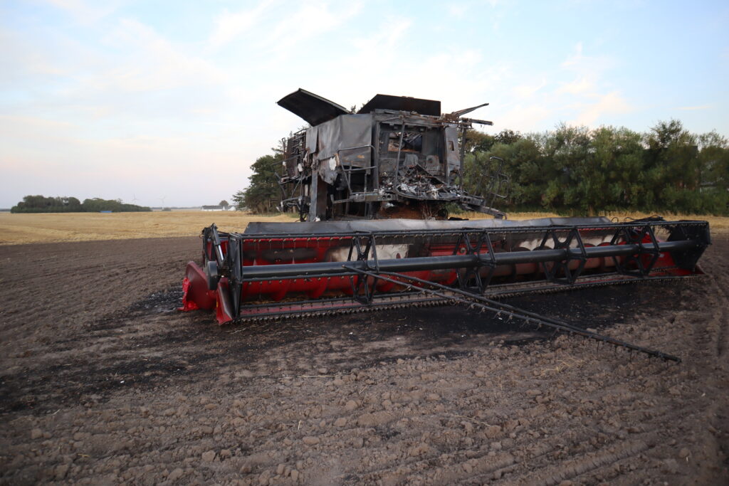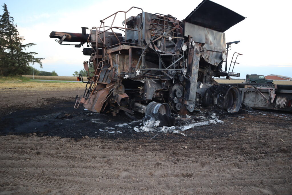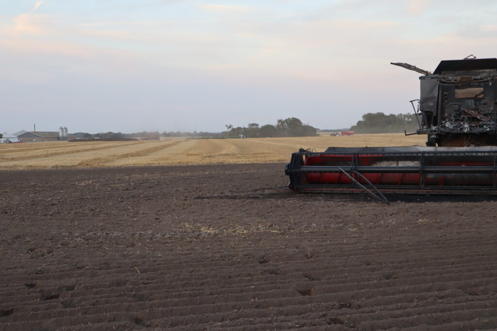 “Chaufføren fortæller, at det enten var et dæk eller dieseltanken, der er sprunget. Det er derfor, mejetærskeren har taget så stor skade”, siger Vagtchef Bo Isaksen fra Nordjyllands Beredskab.
