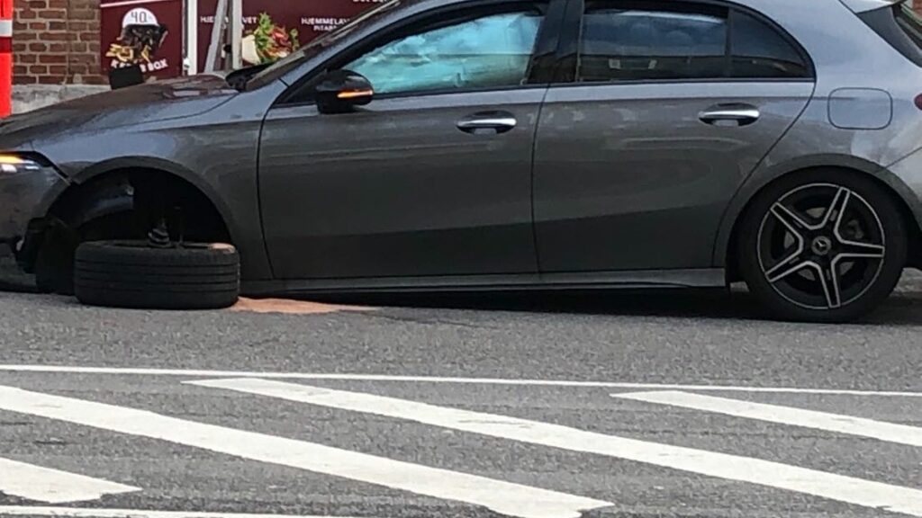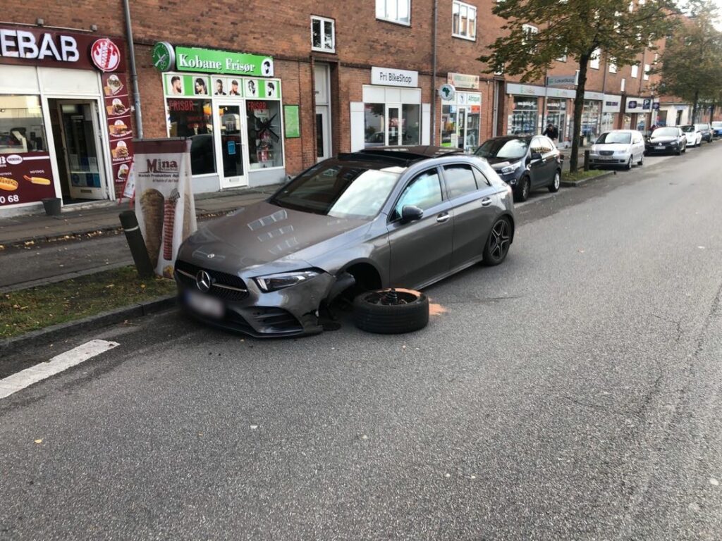 Bilen har fået hjulet flået af under uheldet, hvor også airbags er afgået i bilen.