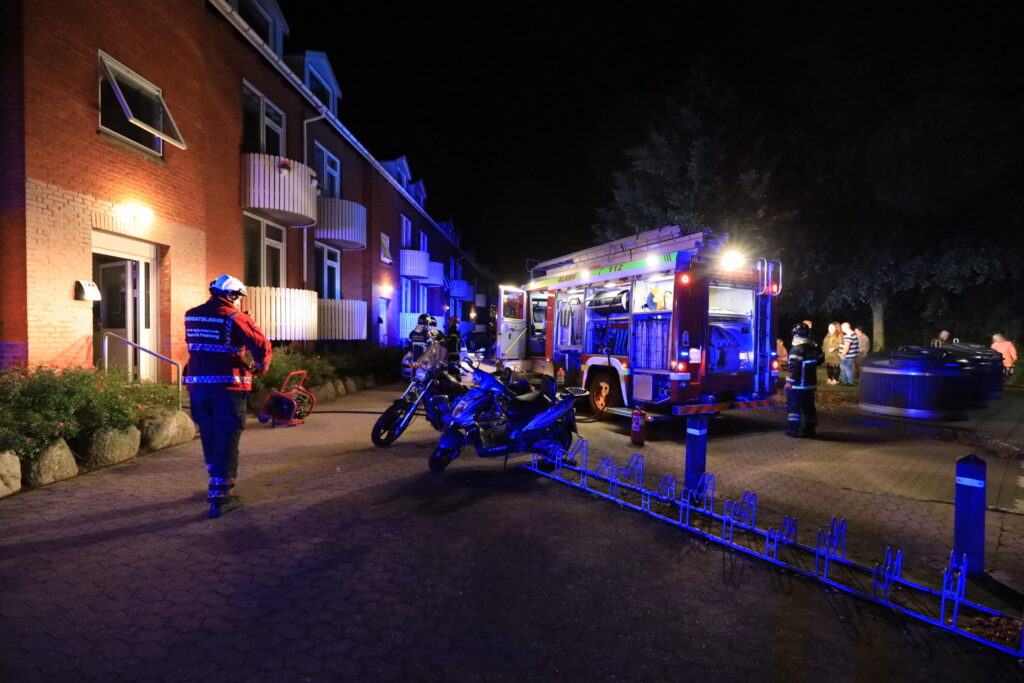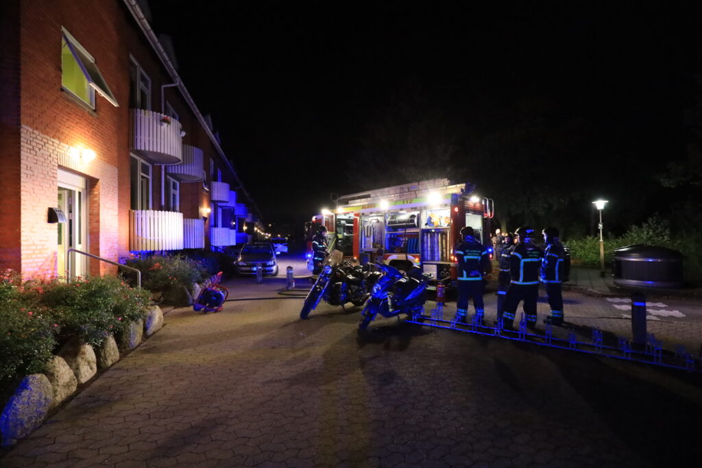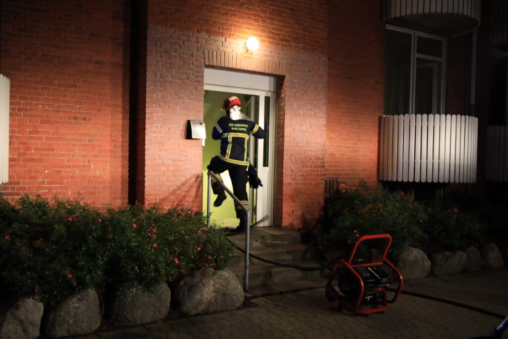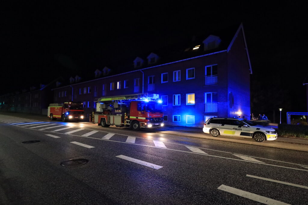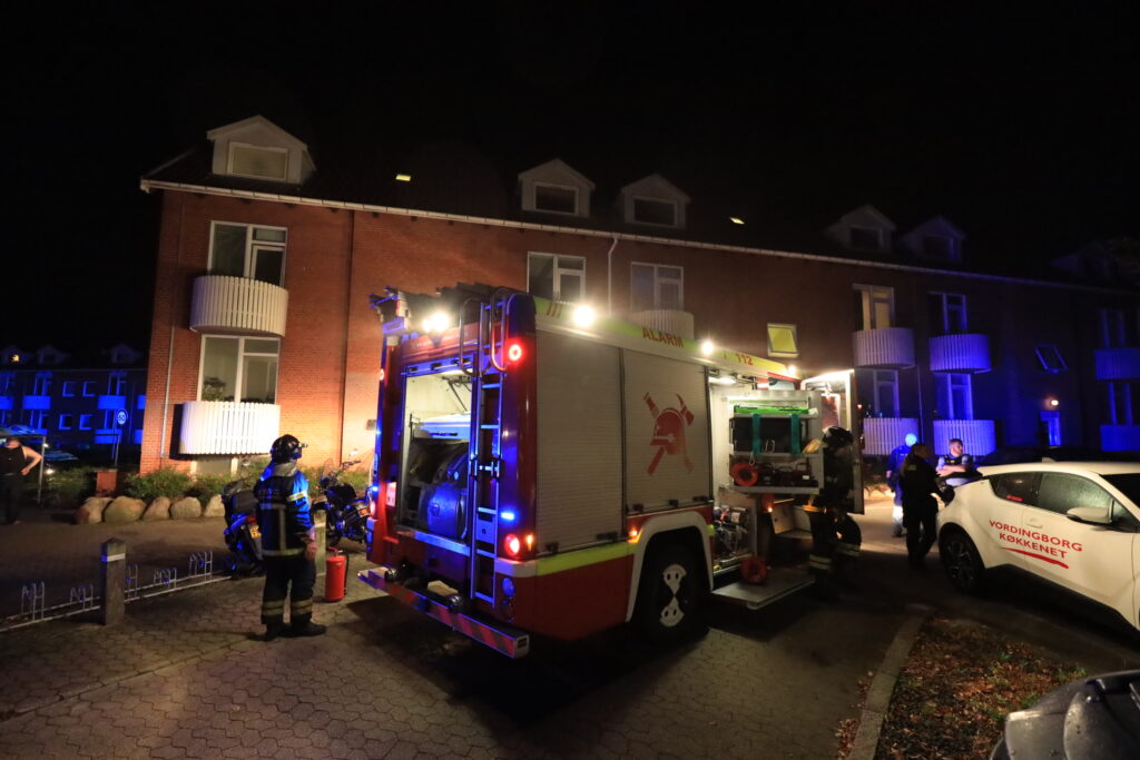 Brandvæsnet er ved at udlufte opgangen efter en mindre slukning af brand.