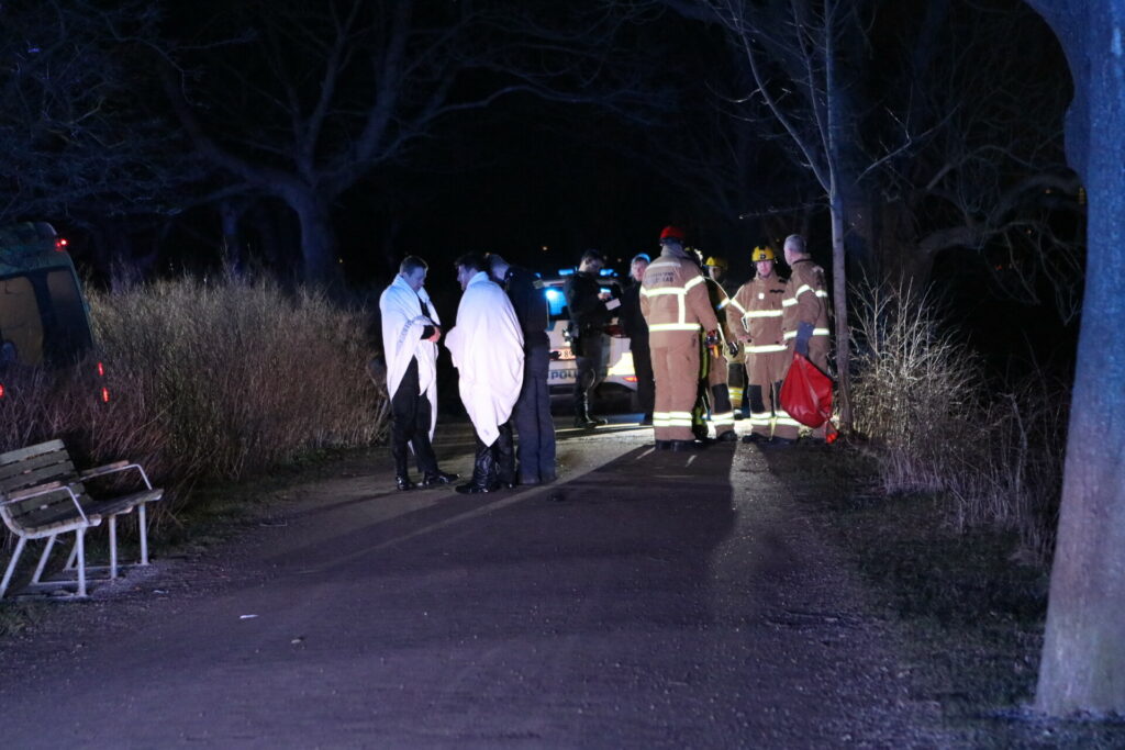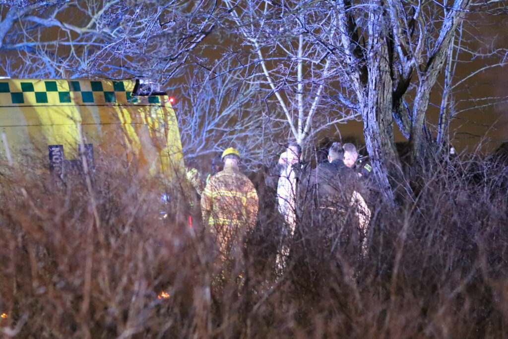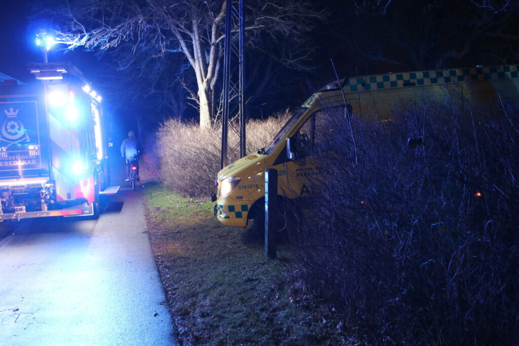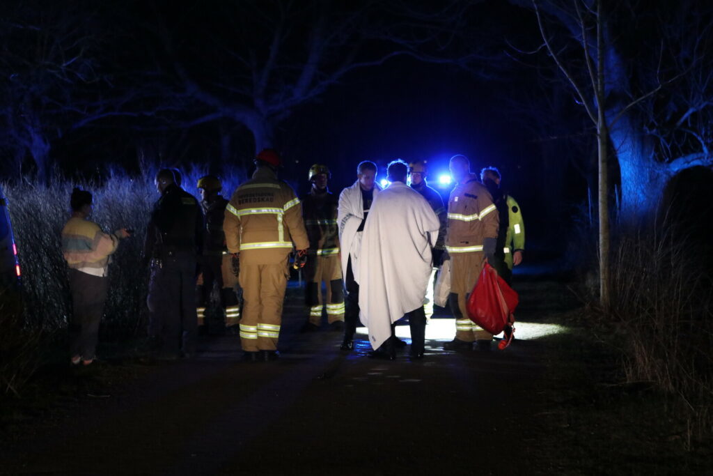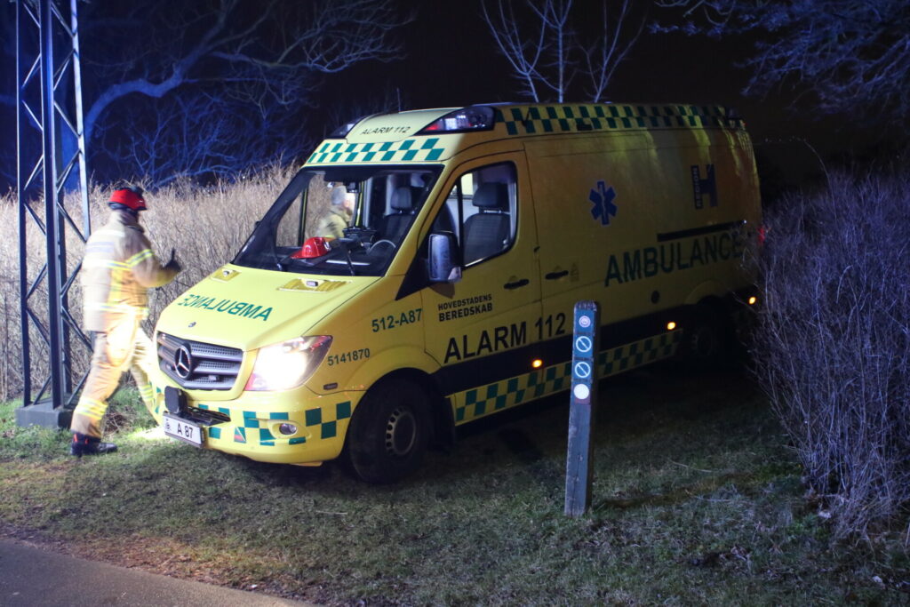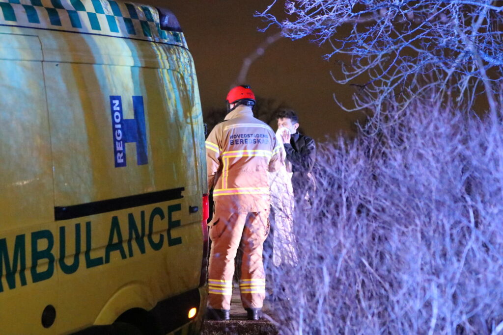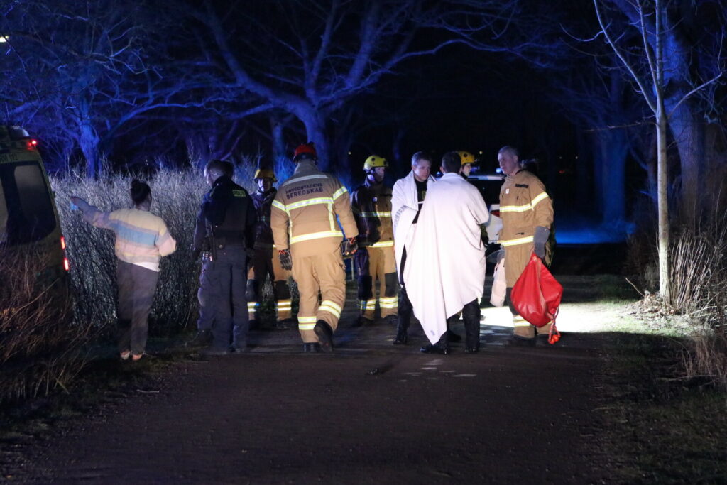 To politi betjente hoppede i vandet og fik personen op, som blev bragt ind i ambulancen, hvor livreddende førstehjælp er i gang.