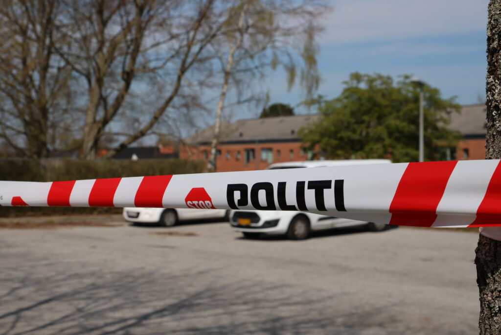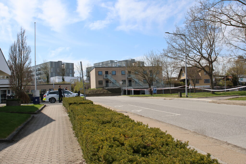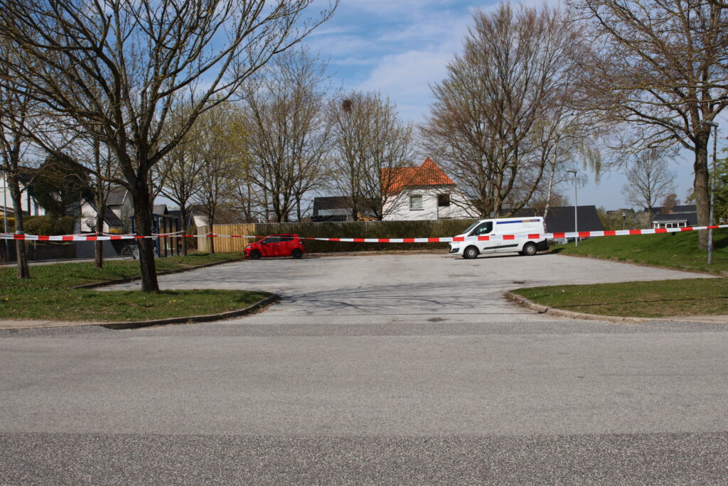 Flere betjente er i gang med at undersøge parkeringspladsen og boligkvarteret, og afspærringstapen fylder det meste af parkeringspladsen ind til bygningerne.