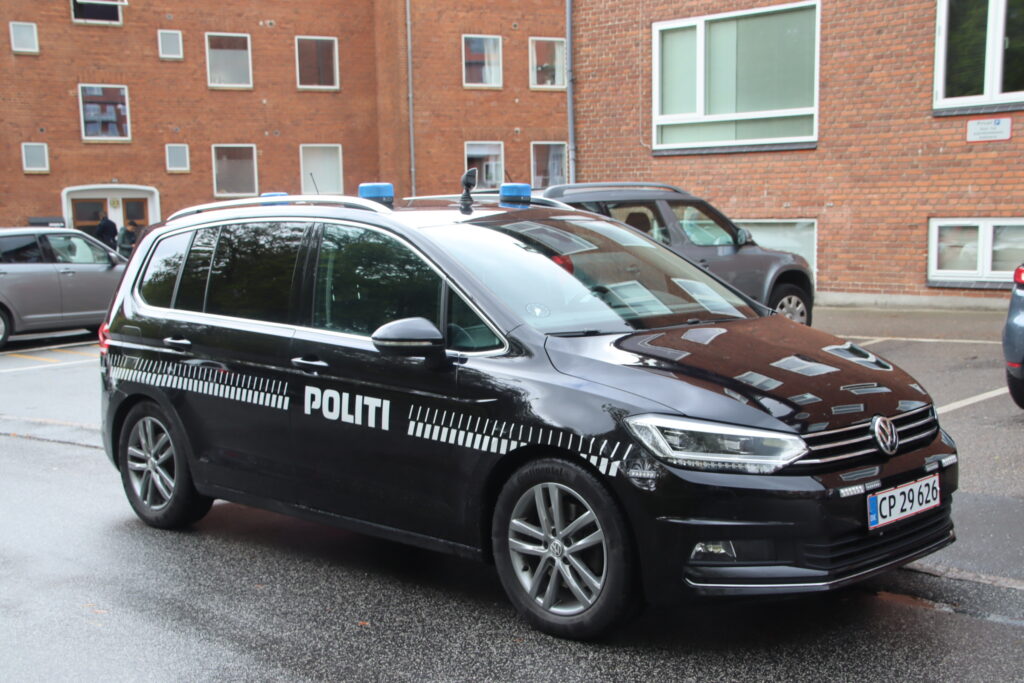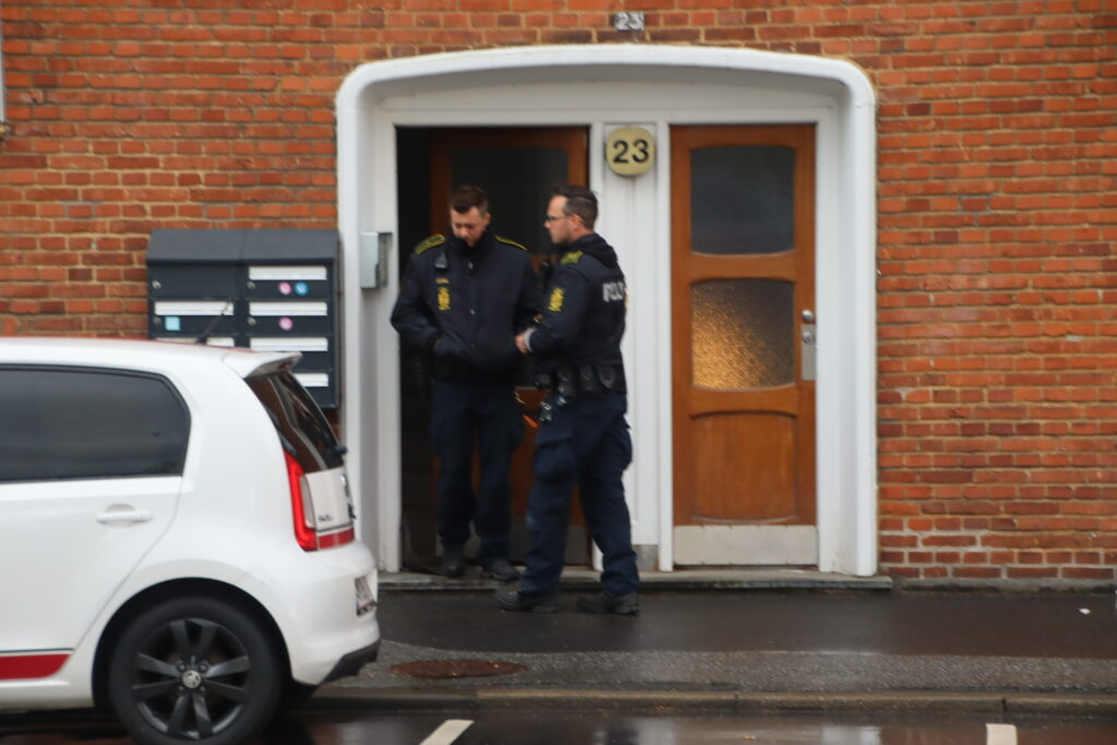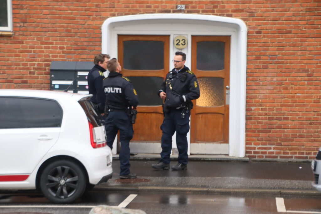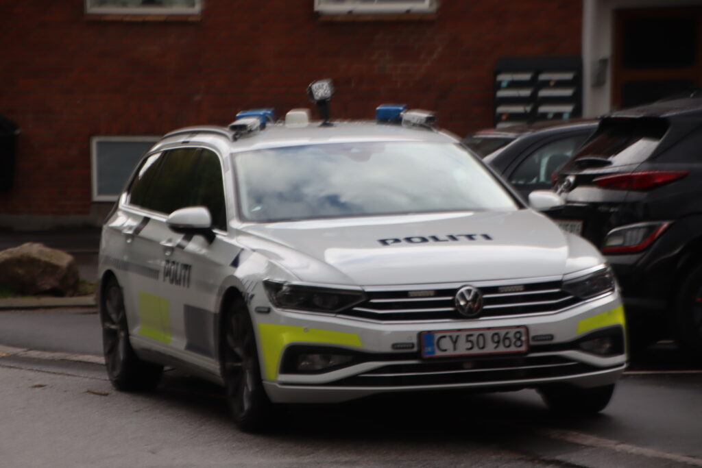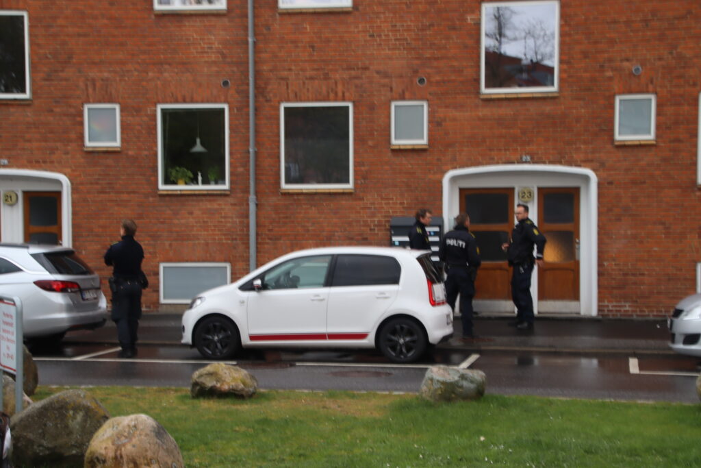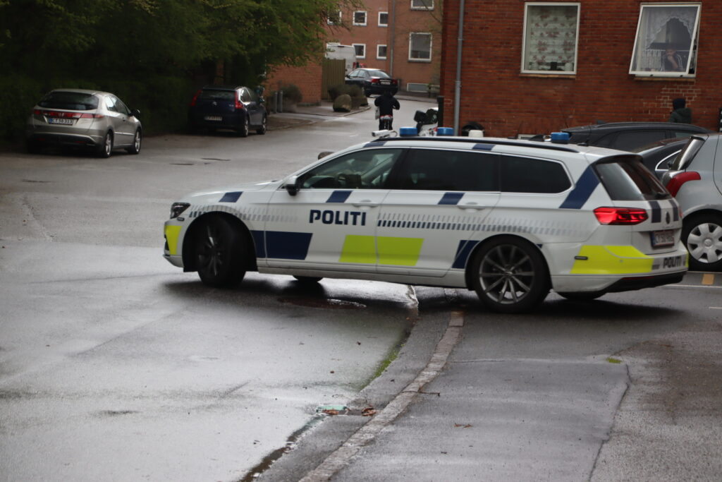 Hundevogn og alm. patrulje vogn med fire betjente, er torsdag eftermiddag til stede på Otto Benzonsvej i Aarhus.