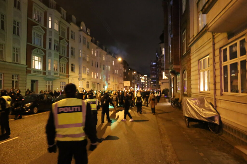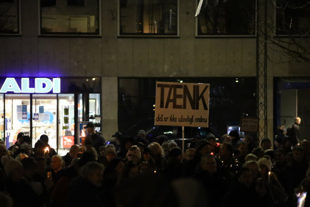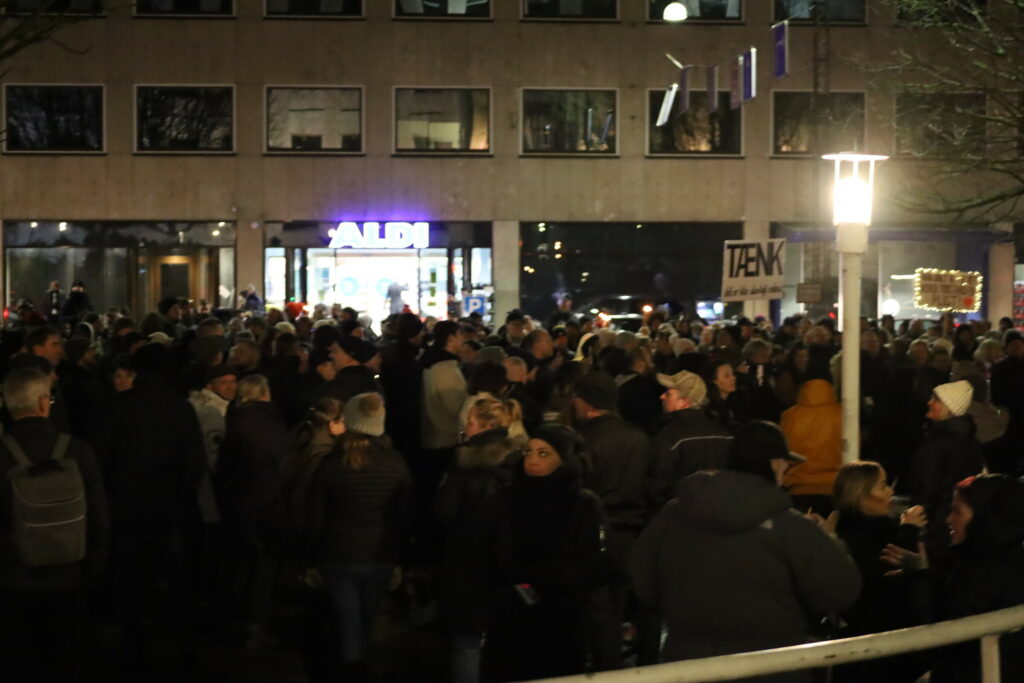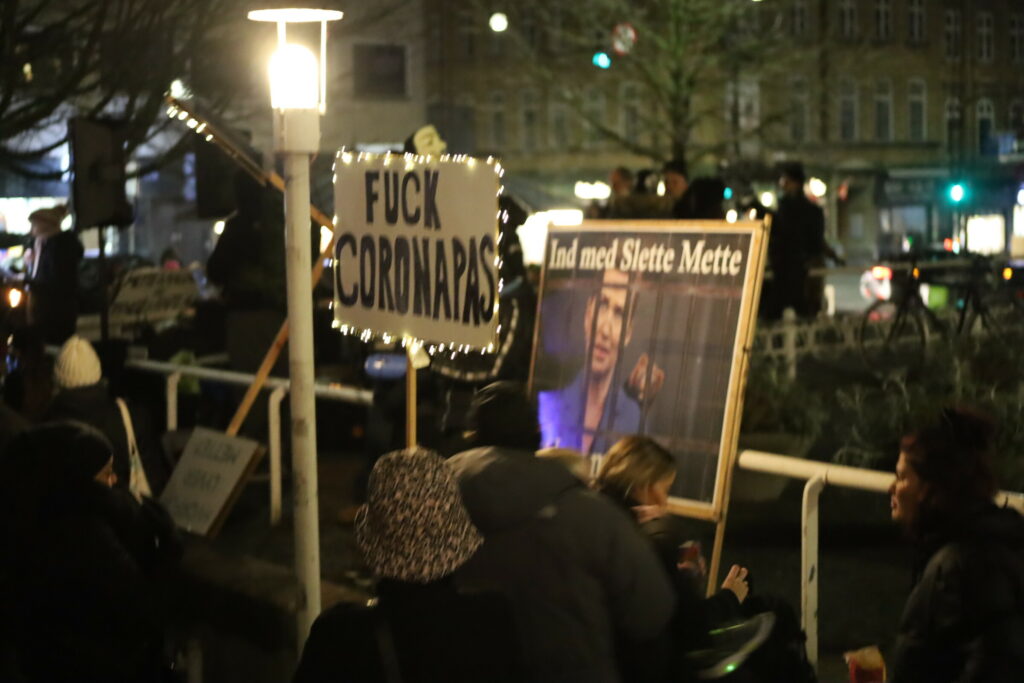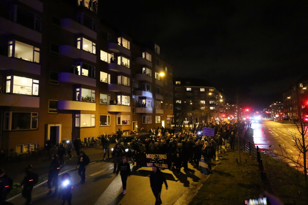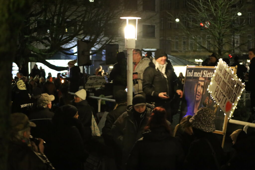 Flere 100 er mødt op med bannere fyrværkeri og opråb som blandt andet “frihed for Danmark – vi har fået nok”.