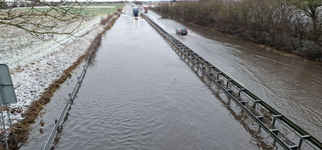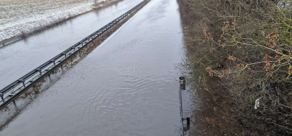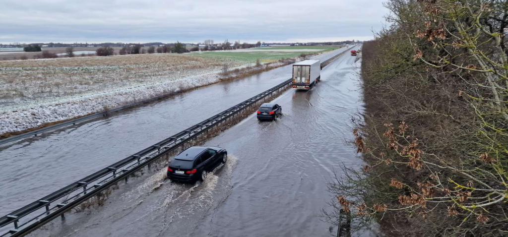 De oversvømmede viadukter har ført til, at store mængder vand har lagt sig på motorvejen.