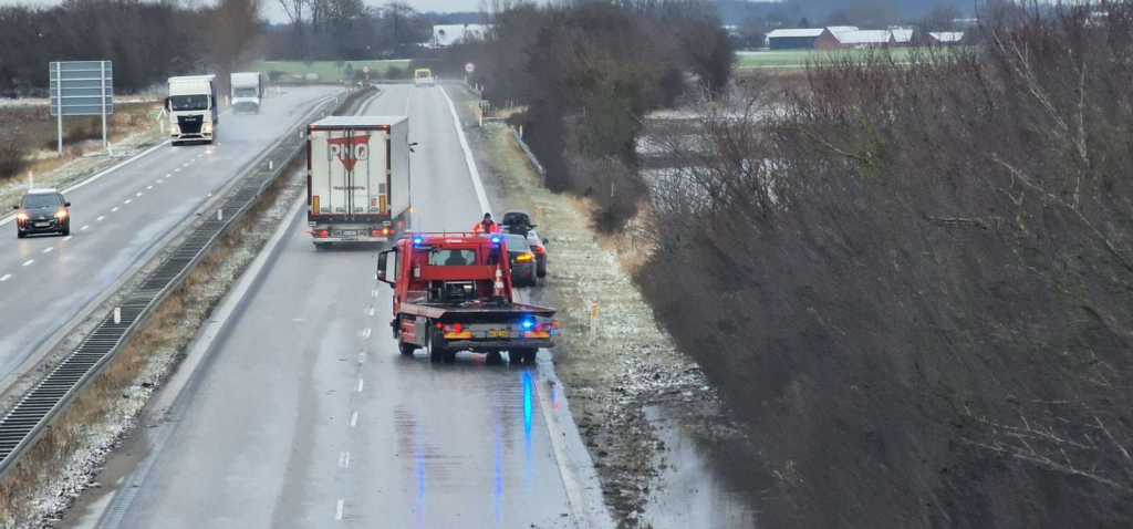 Politiet har fået melding om, at en enkelt bil er endt ude i vandet på motorvejen, men ingen er kommet til skade.