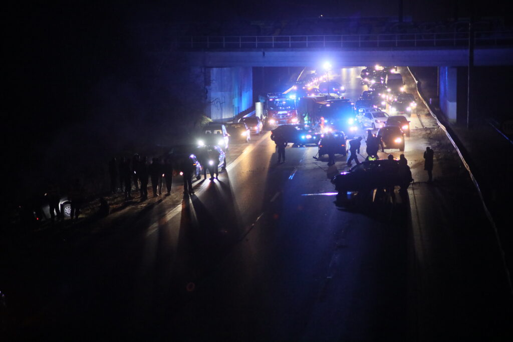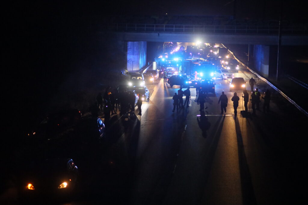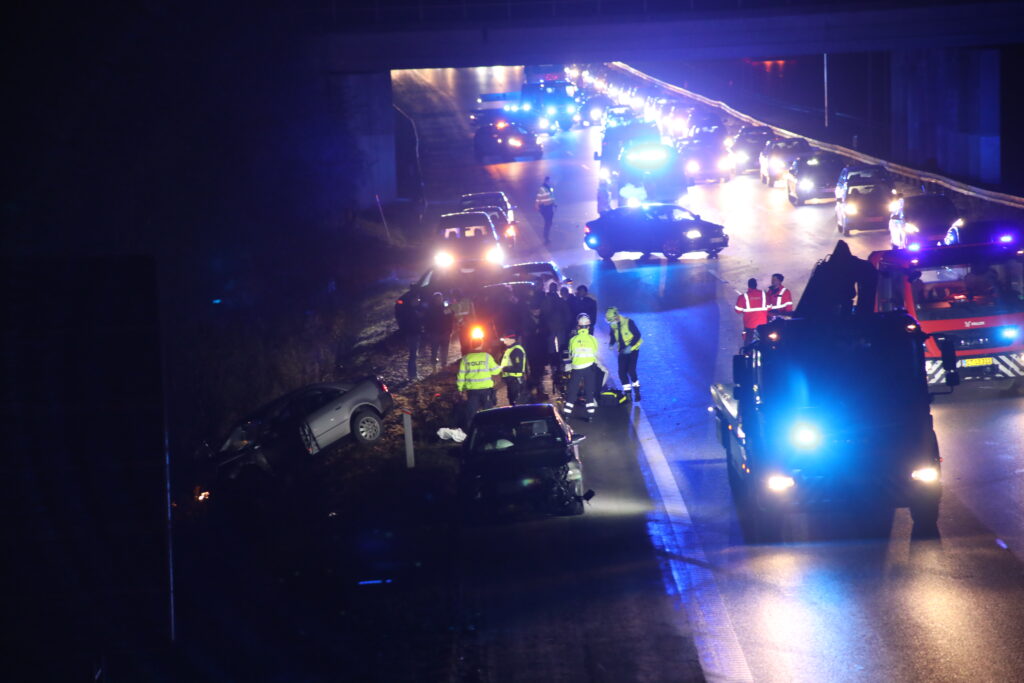 Motorvejen er spærret i den ene retning, og vidner fortæller til Presse-fotos.dk på stedet, at flere personer er set løbe fra stedet.