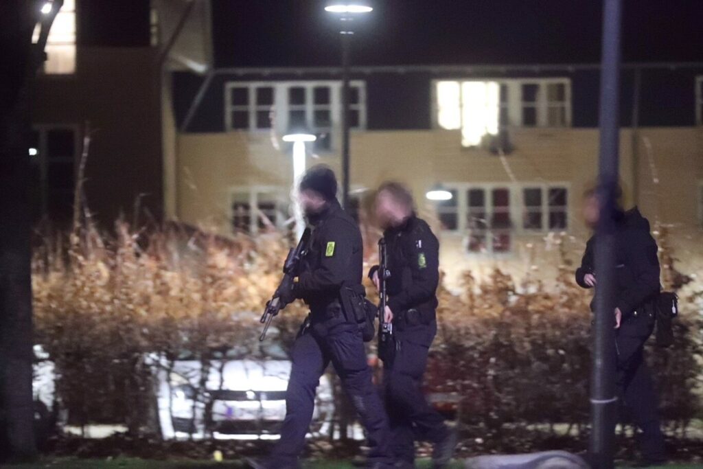 Patruljerne søger rundt i området, med kampklare betjente med maskinpistoler