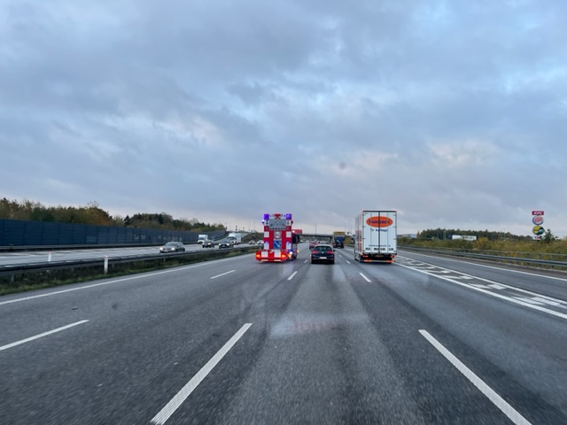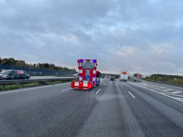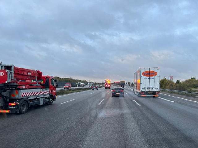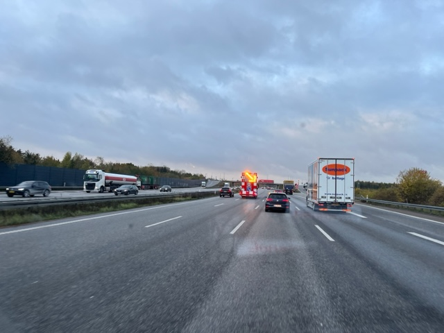 Da der er blevet tabt en spændestrop på kørebanen. Den er nu fjernet og trafikken kan glide igen, oplyser vejdirektoratet.
