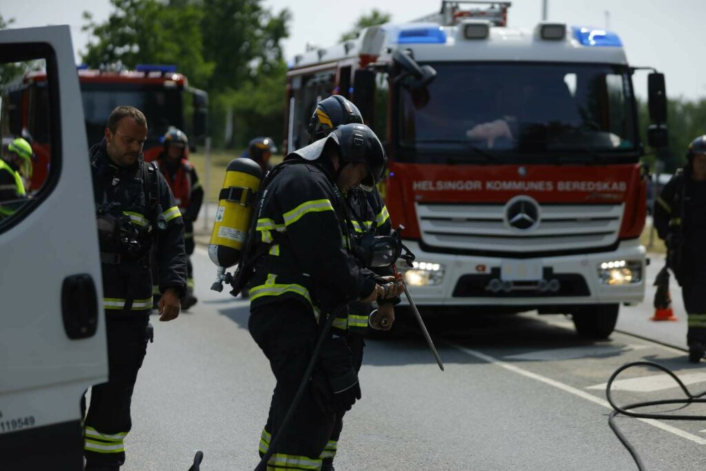 Flere brandkøretøjer og en politibil ankom kort efter anmeldelsen til stedet, hvor røgdykkere gik i gang med brandslukningen.