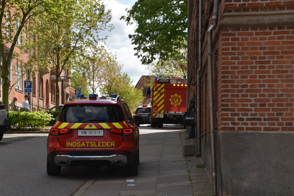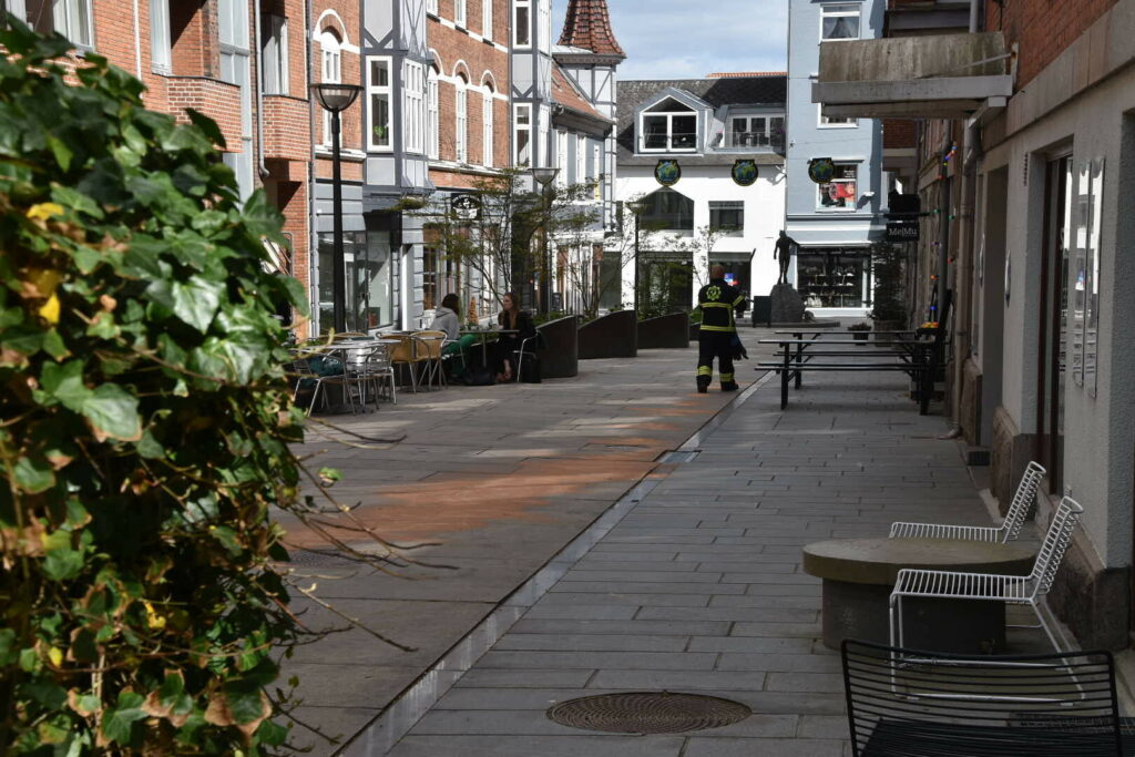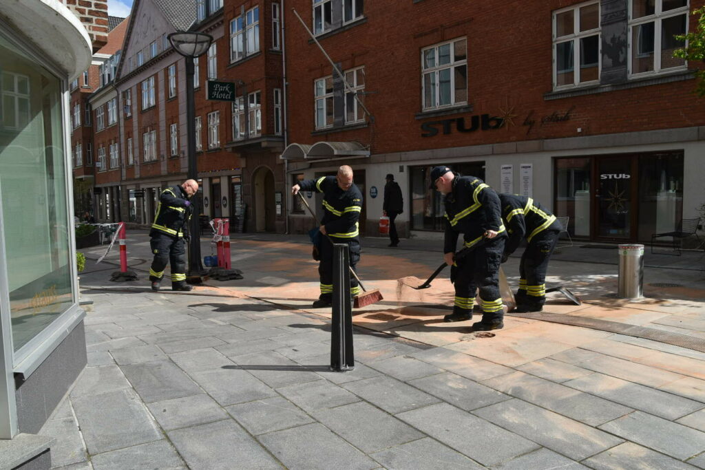 Søndag eftermiddag er brandvæsenet til stede i Gågaden i Vejle. Et mindre uheld har betydet oliespild på en del af gaden, hvilket brandfolkene sanerer.
