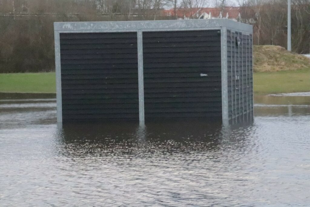 En å blandt andet gået over sine bredder og oversvømmet en gang- og cykelsti, mens også et skur på stedet står under vand.