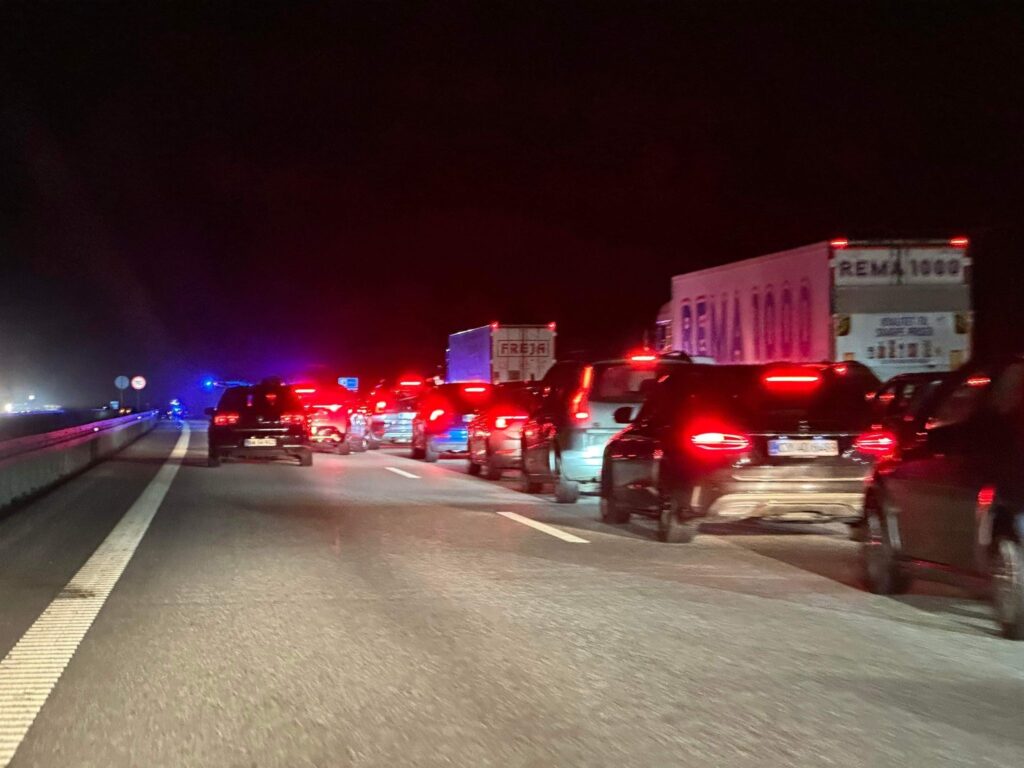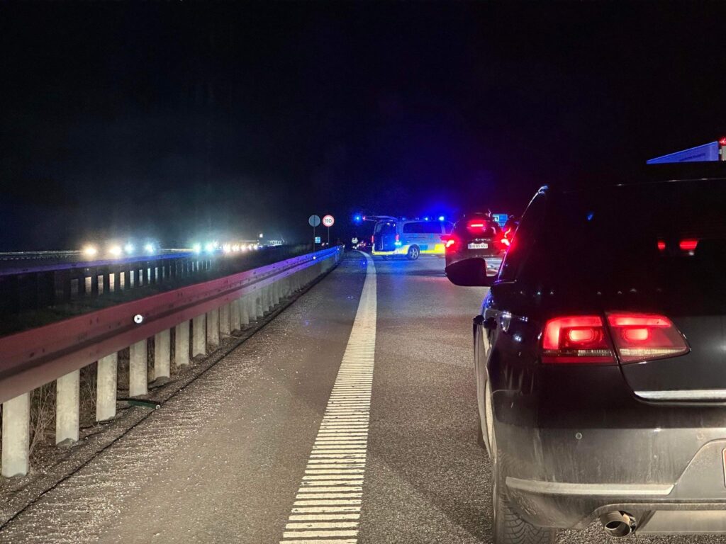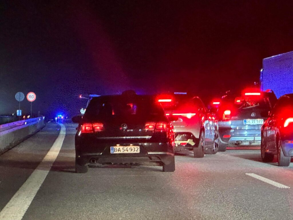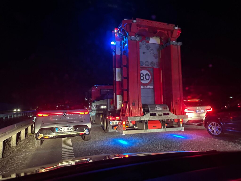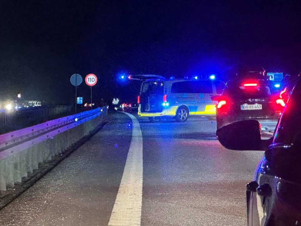 Søndag aften er politiet netop ankommet til en melding om, at der er tabt gods på motorvejen.