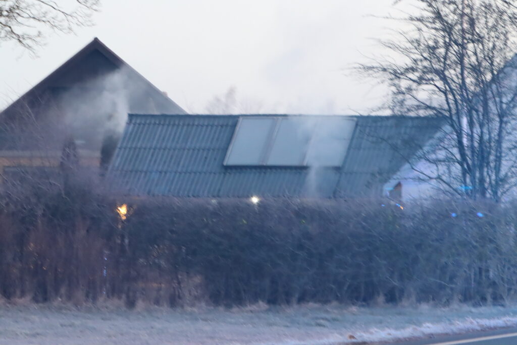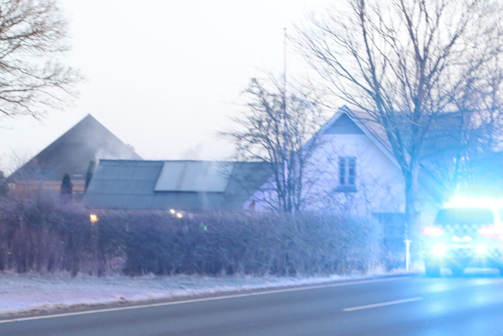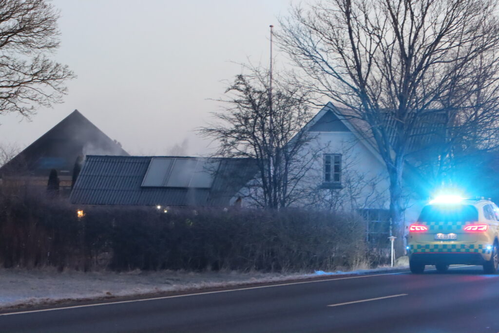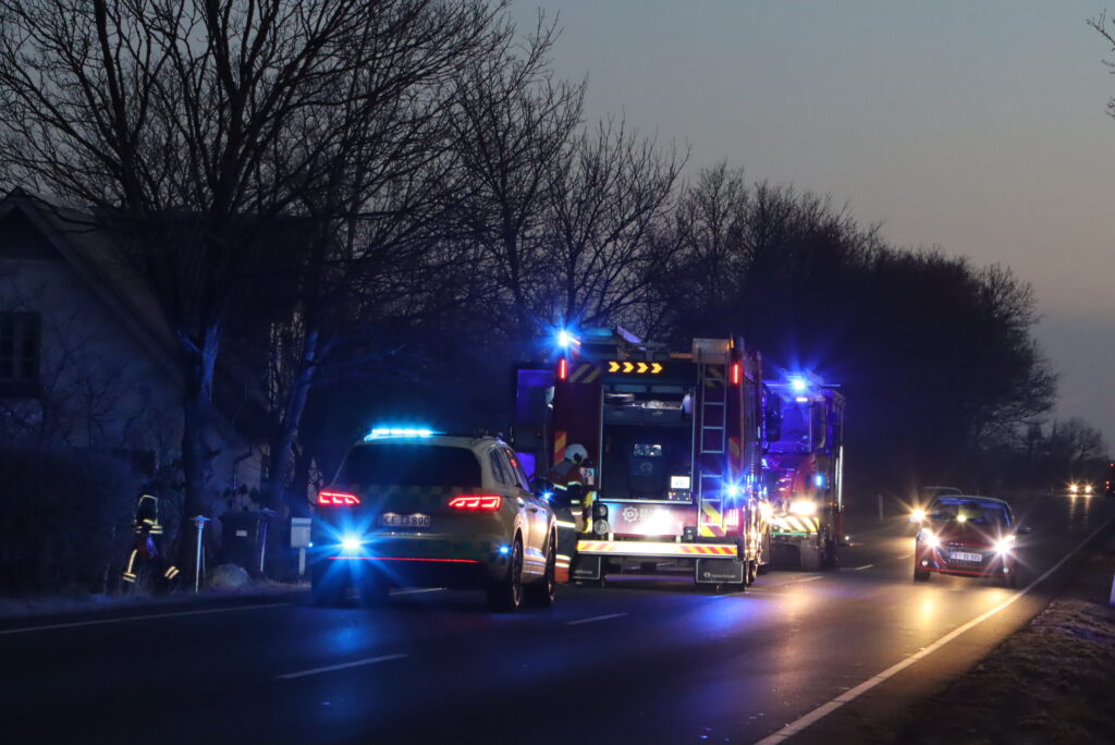 Brandvæsnet er i gang med slukningsarbejdet og ambulance og lægebil står ”stand-by”.