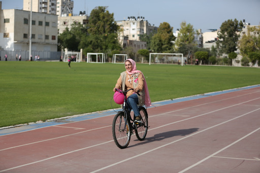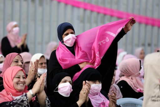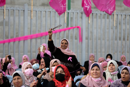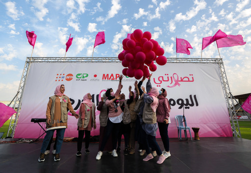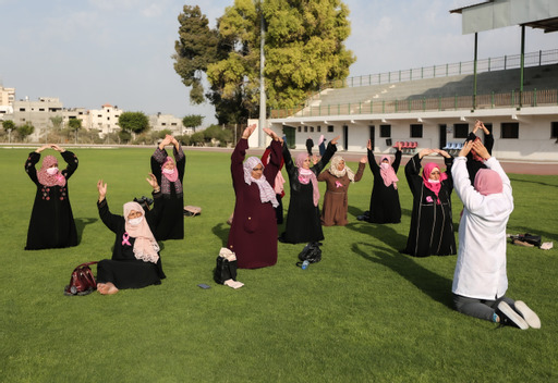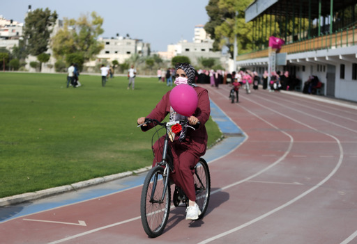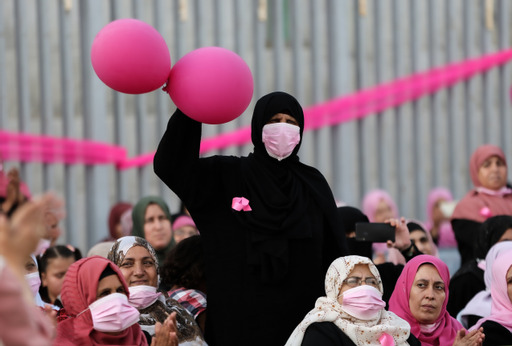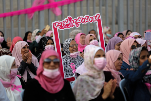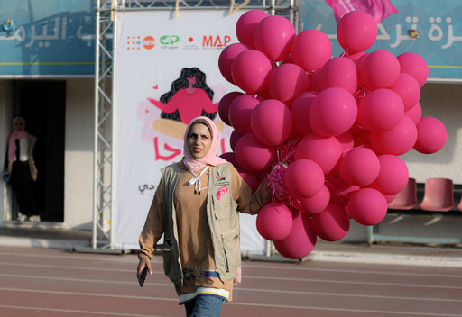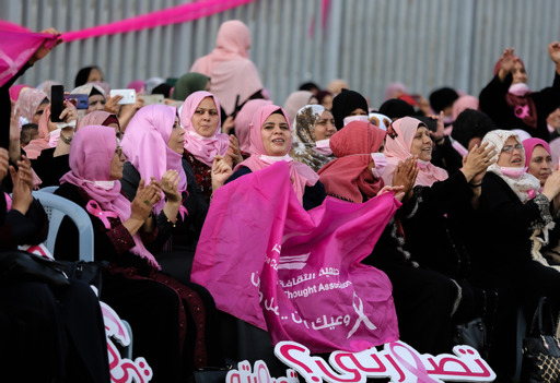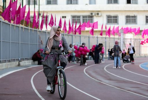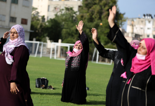 Palestinian women participate in the Pink Sports Day, during a campaign aiming to support breast cancer survivors during “Pink October” to raise awareness of breast cancer, make pink a subject for this initiative, and the need for early screenings to detect breast cancer, in Gaza City.
