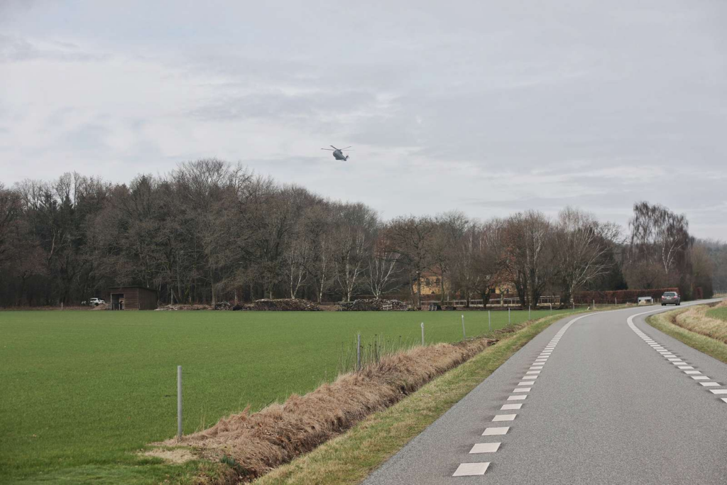 En helikopter er sat i luften i Grimstrup.