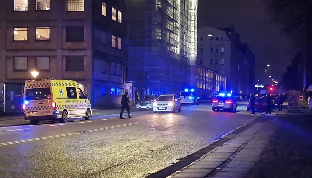 “Vi er massivt til stede i området, hvor vi har kontakt til en 23-årig mand, der er blevet ramt af en skarp genstand”, fortæller Henrik Stormer, vagtchef, Københavns Politi, til Presse-fotos.dk.