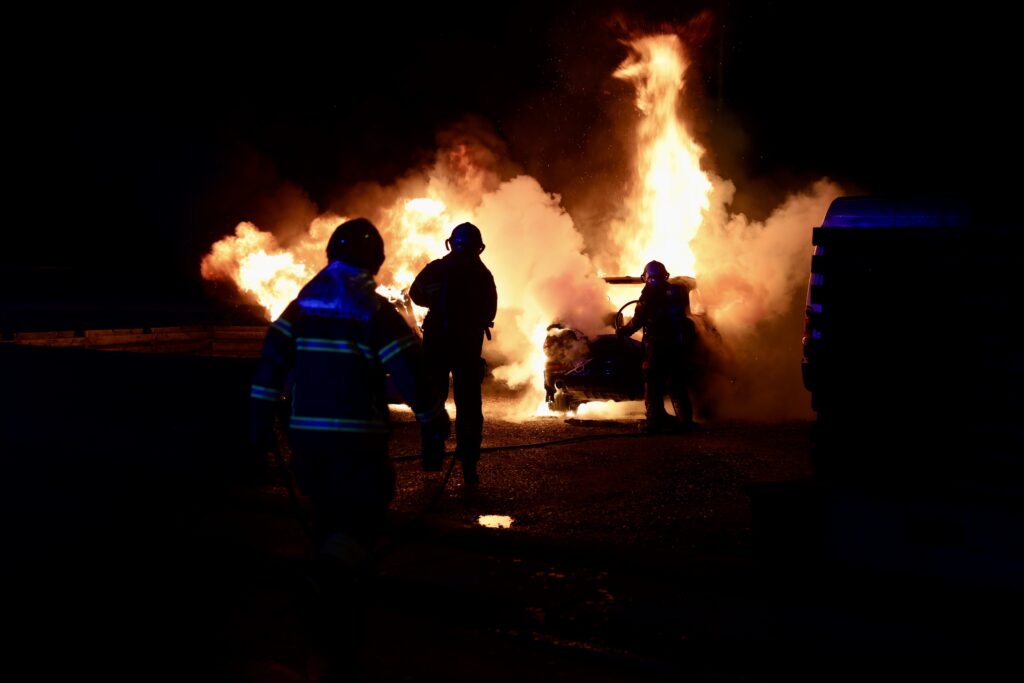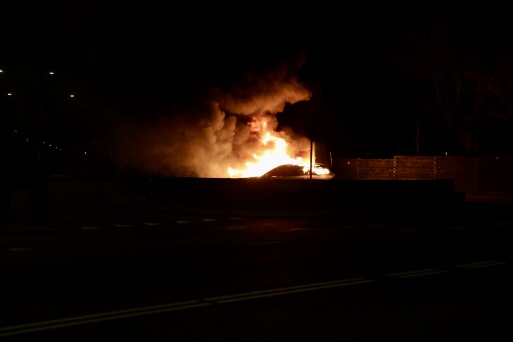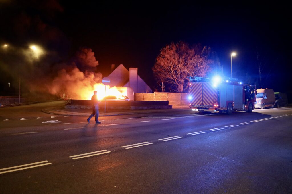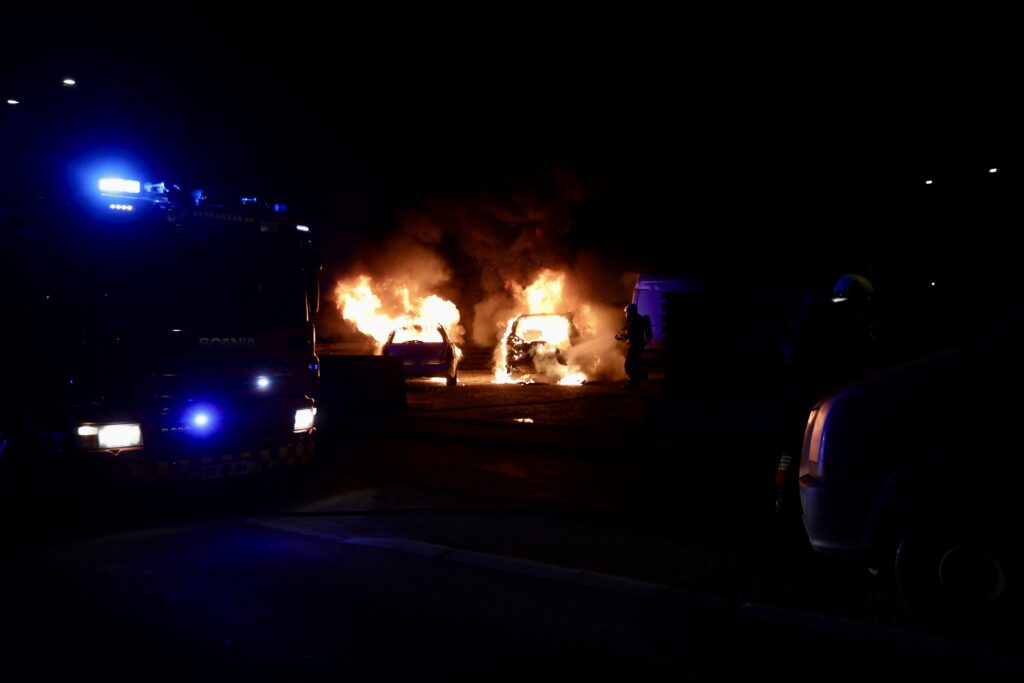 To biler står natten til torsdag i flammer på Røglevangen/ Taastrup hovedgade i Taastrup.