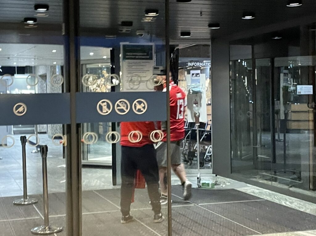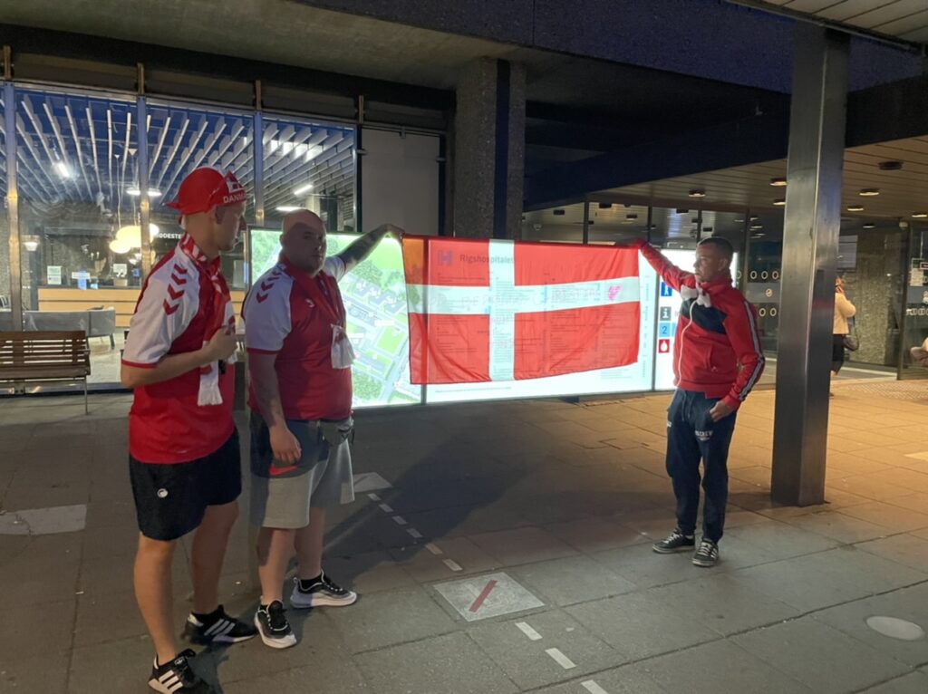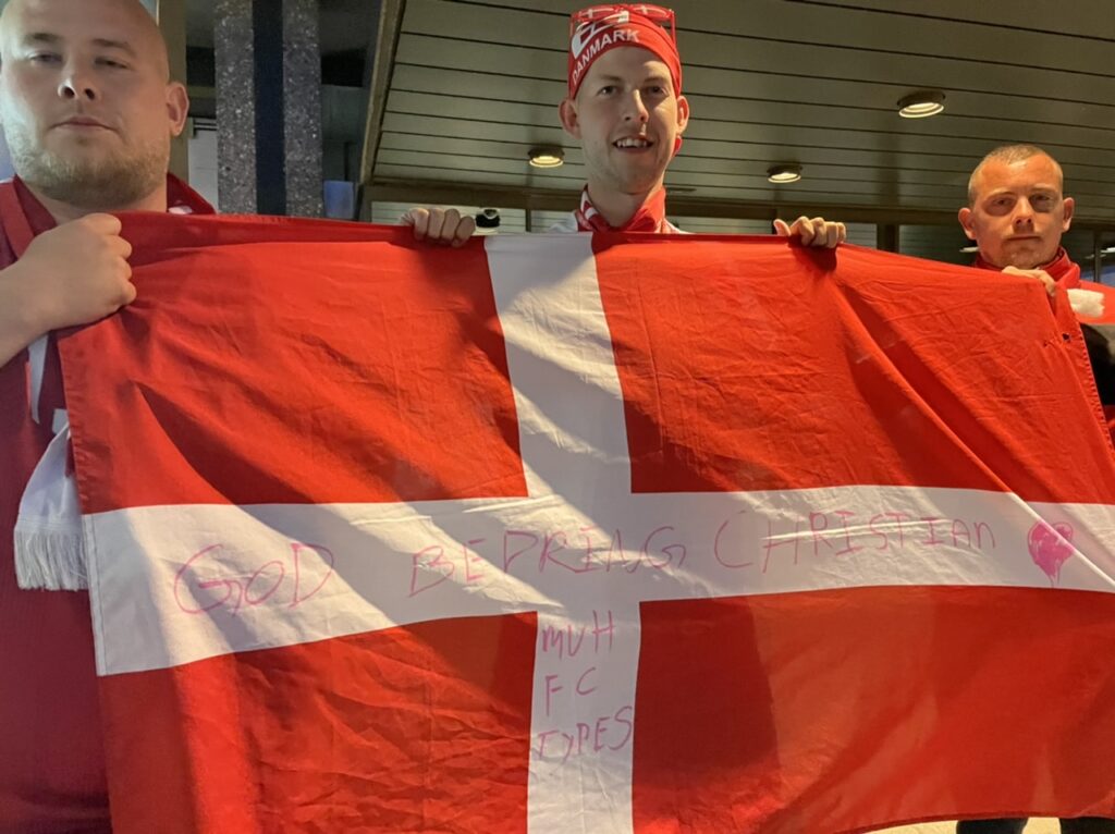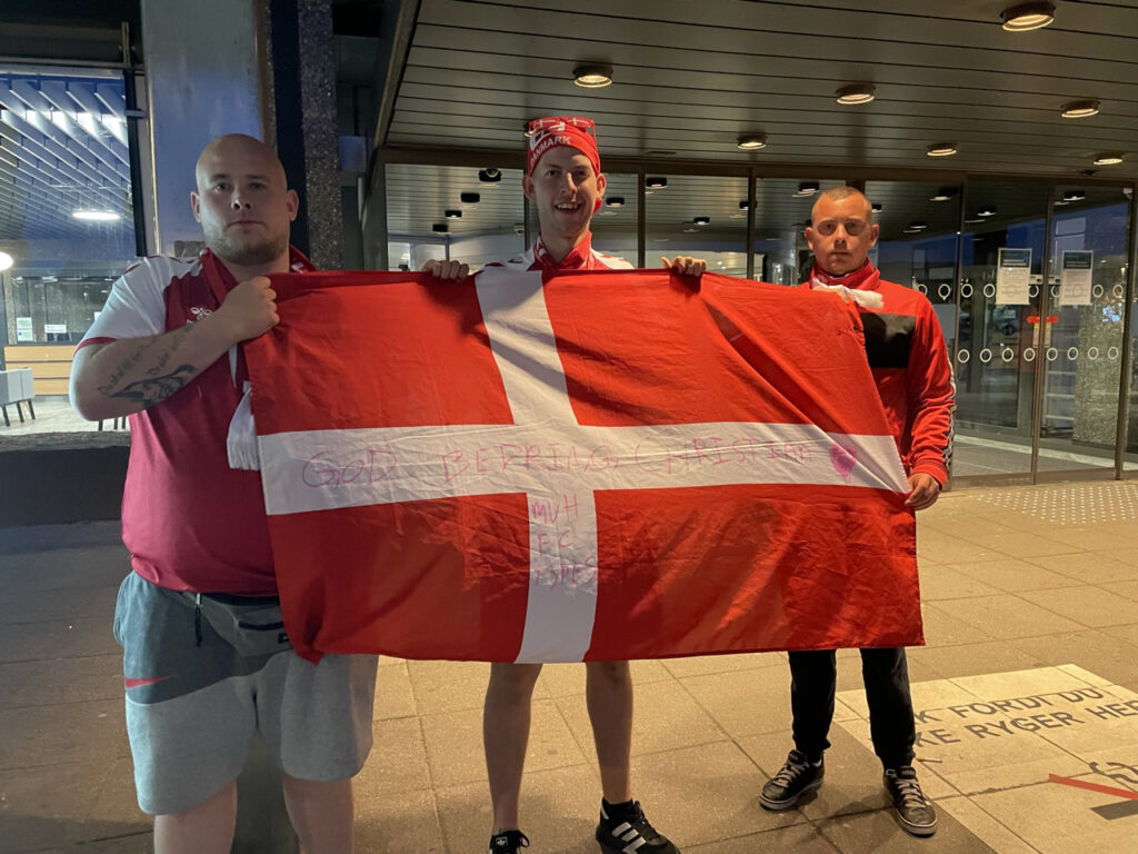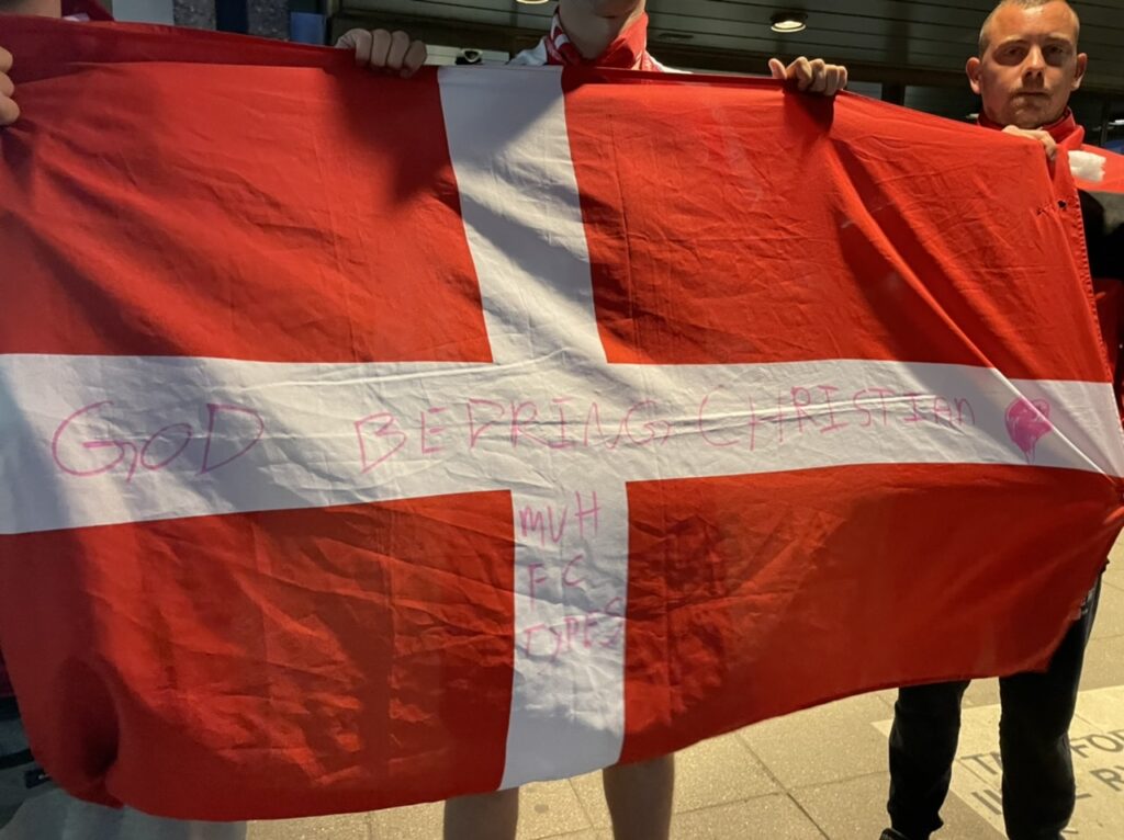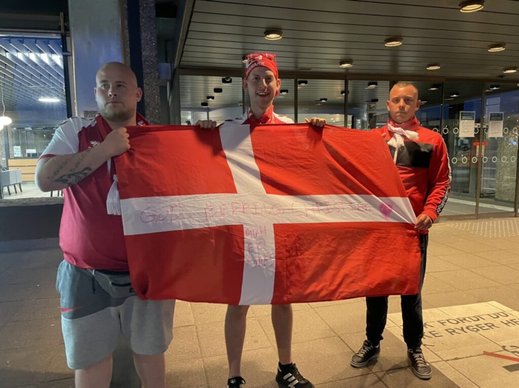 Med er dannebrog med påskriften ‘God bedring Christian’ mødte en mindre gruppe roligans lærdag aften op på Rigshospitalet i København.
