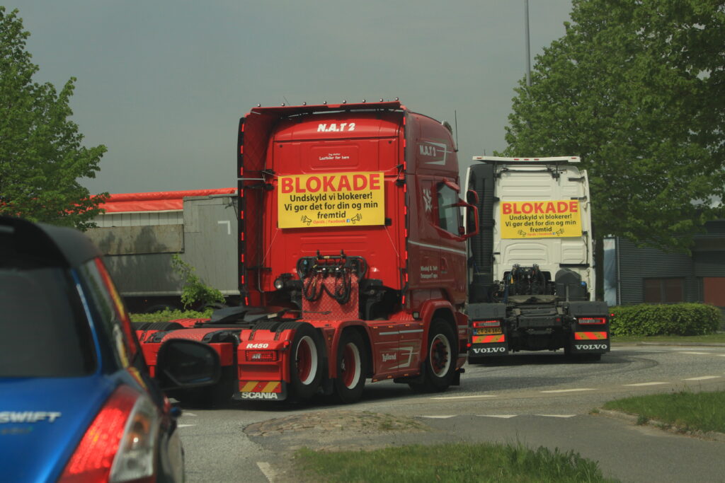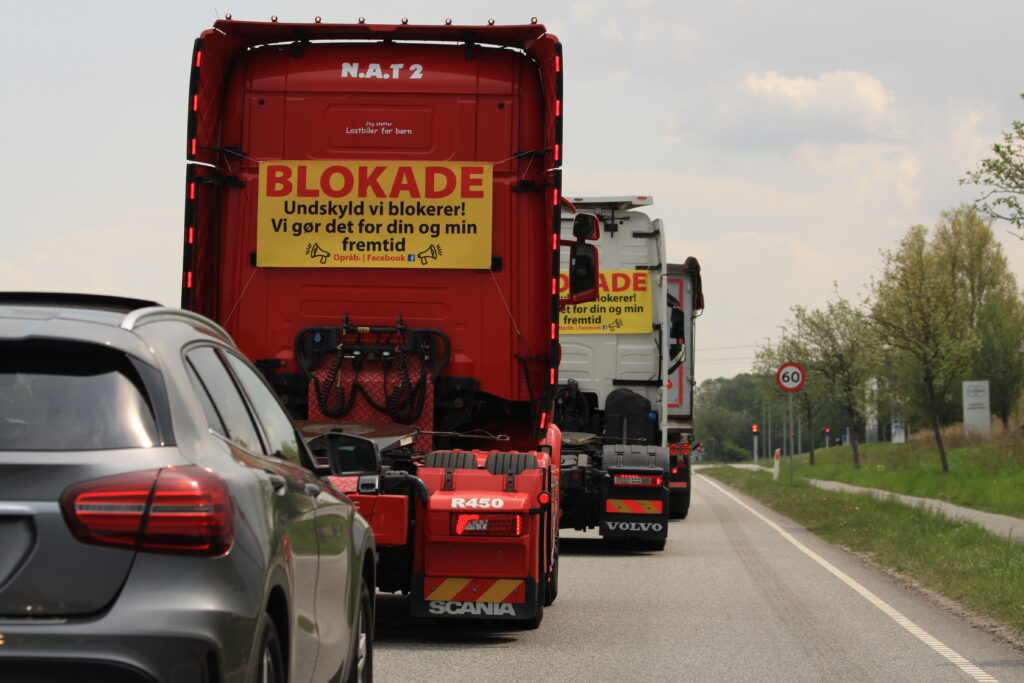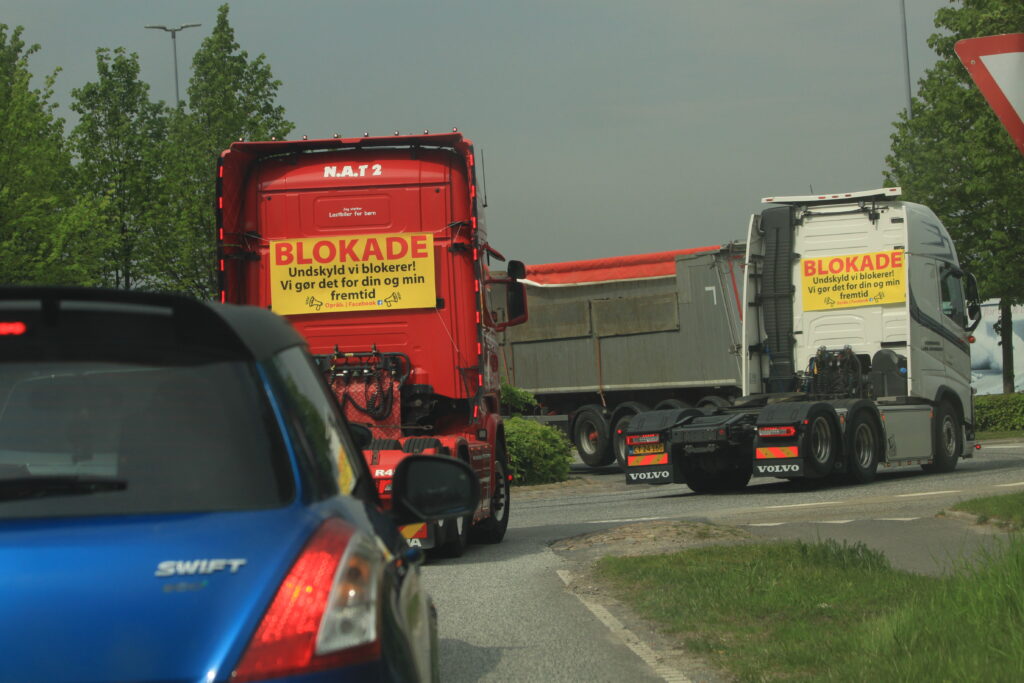Mandag formiddag er mange lastbiler kørt ud på motorvejen syd for Aalborg. Strategien er den samme som fra i morges, hvor man kører ned på motorvejen og sætter hastigheden helt ned til 40 kilometer i timen.